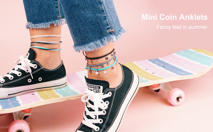 • Braided Coin Anklets: Featuring silver coins and colorful strings, these anklet packs are sure to bring a little luck to each day.