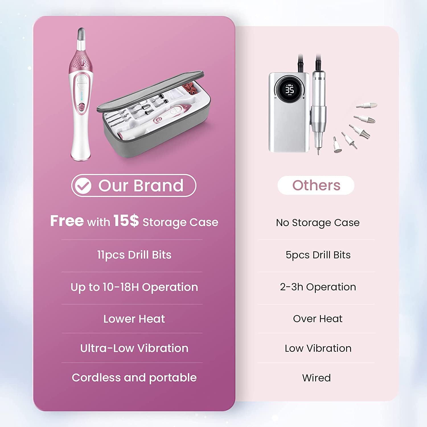 ★【Rechargeable, Cordless and Use up to 10-18 hours】New Version nail drill machine- the built-in lithium battery delivers up to 10 -18 hours of cordless use when fully charged. The LED light provides a highlighted view during use, achieving a precise manicure and pedicure. Have salon-quality manicures and pedicures at anytime anywhere.