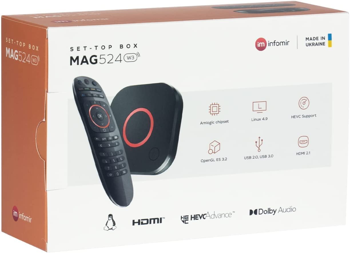 The newest MAG box from Infomir, the MAG524W3, replaces the popular MAG424W3 model. The MAG524W3 is a high performance 4K Linux IPTV set top box with a newer, 25% faster processor. The MAG524W3 comes with built in 2.4/5G wifi, 4K and HEVC support, 1 GB RAM, 4GB eMMC storage, HDMI 2.1 and more.