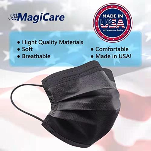 MagiCare Made in USA Masks - Black Face Masks Disposable - Premium 3 Ply Face Mask for Adults - Comfortable, Soft, Breathable - Black Face Masks Disposable Made in USA - 50ct Box