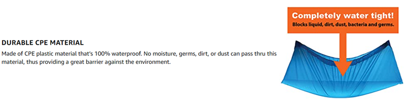 • WATERPROOF: Made of CPE plastic material that’s 100% waterproof. No moisture, germs, dirt, or dust can pass thru this material, thus providing a great barrier against the environment