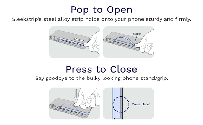 • Hand-Free Viewing - With SleekStrip, you get a phone stand and phone grip in one! Sturdy and functional, our high-quality Android and iPhone grip makes a convenient cellphone stand whenever you’re watching a movie or scrolling through your device.