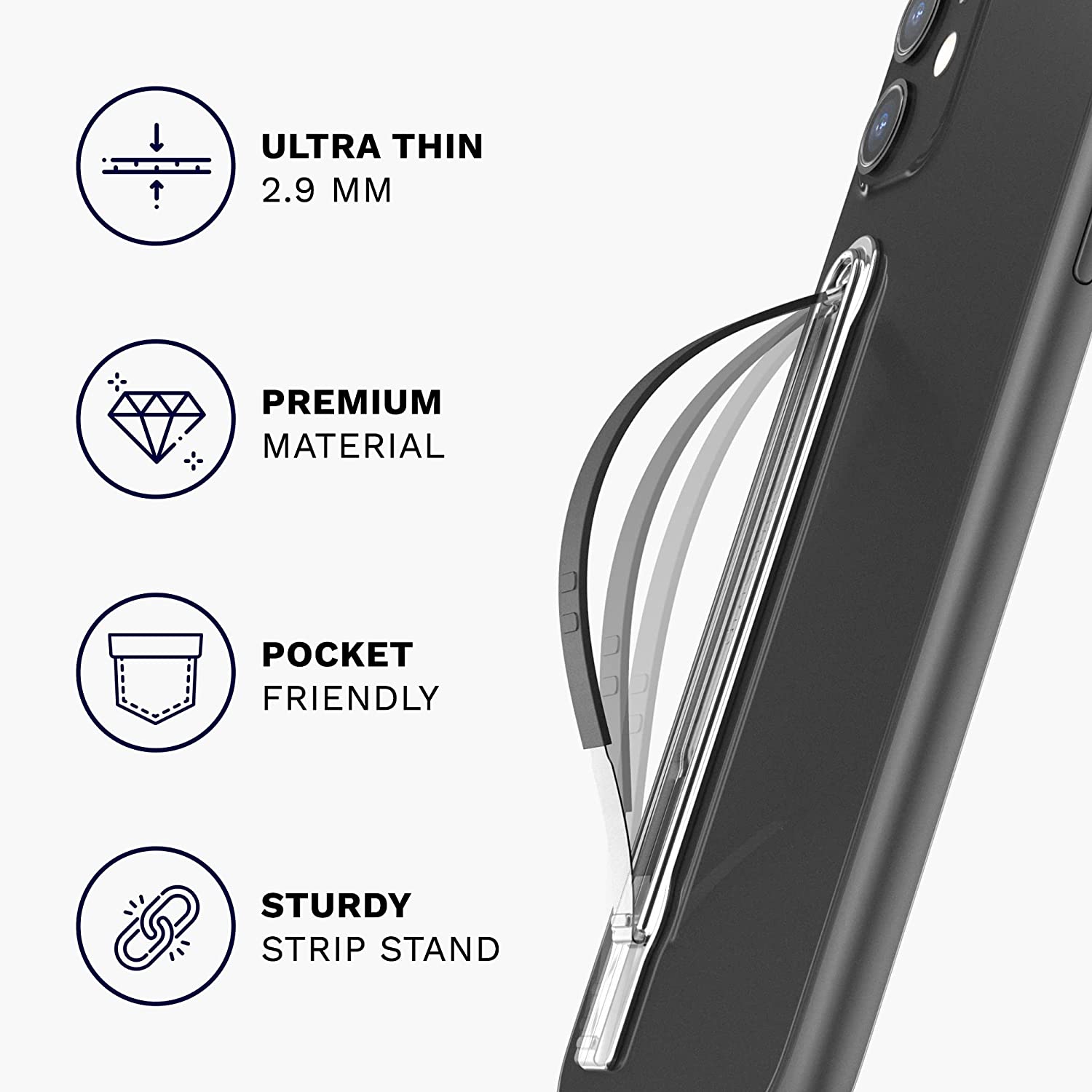 • Slim and Durable Grip for Cell Phones - SleekStrip phone grip is made of premium space-grade alloys and specialized steel to ensure durability and versatility. At only 0.11 inches, SleekStrip fits in your pocket or your small bag.