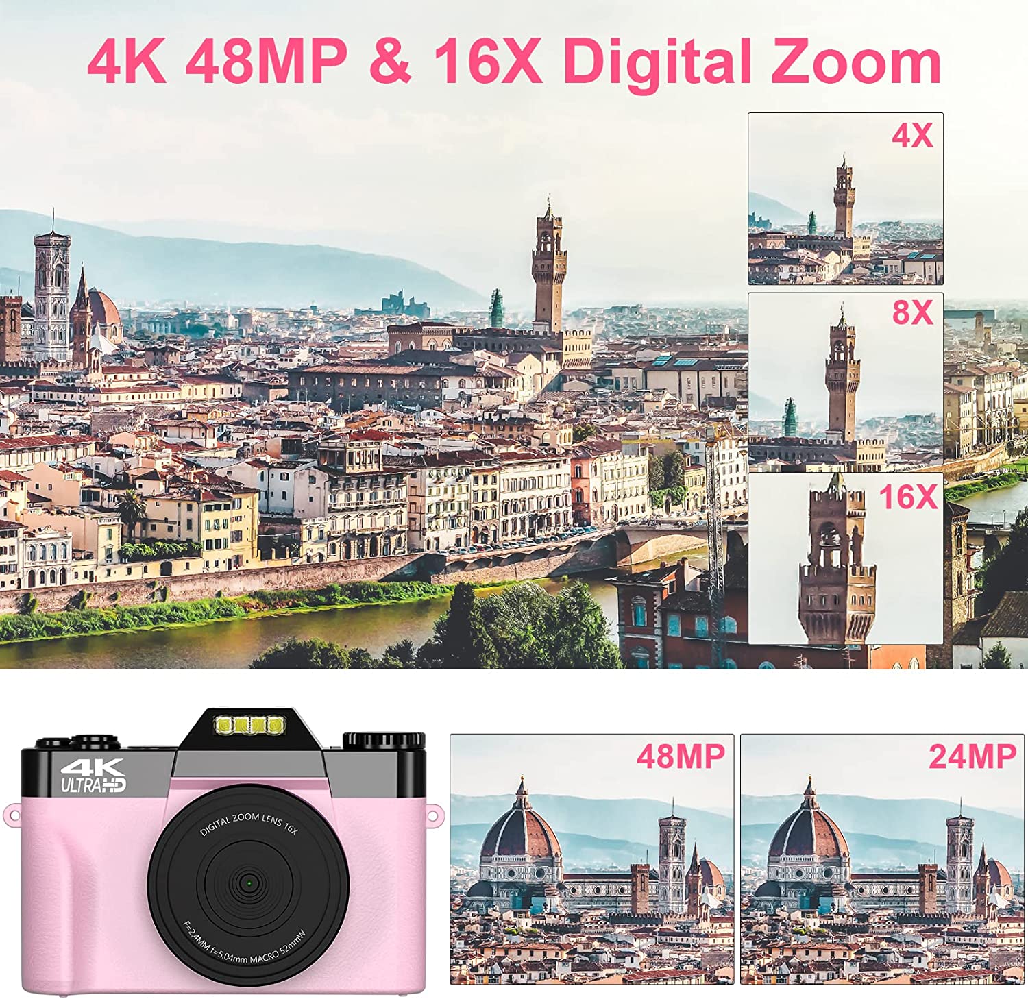 ?【Camera for Photoggraphy and Video】The digital camera featuring 4K video and 48MP photo resolution, the vlogging camera supports 16X Digital Zoom, Video Pause, Recording while Charging, Loop Recording, Continuous Shooting, Silent Recording, Self-Timer. with the latest upgraded chip to ensure the camcorder images more high-definition, more realistic. It’s the best gift for friends and family.