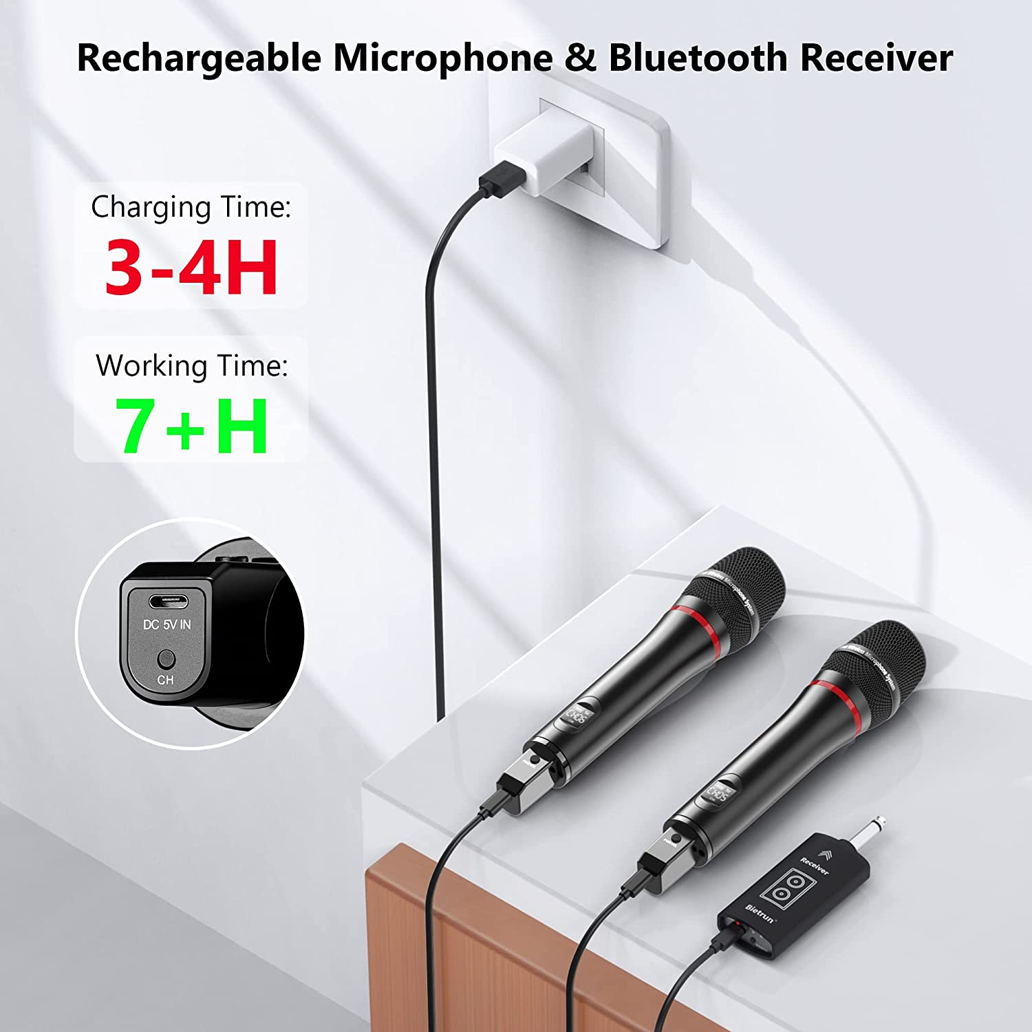 Rechargeble Microphone: ●No need to purchase additional AA batteries. ●The microphone and receiver are both built-in 1200 mAh rechargeable lithium-ion battery. work time up to 7 plus hours with charging time 3-4 hours.●The charging cable are included in package,support charging the dual microphones and receiver in one cable at the same time.●Cool led light ring (working in green,charging in red),and a enhance fashion clear white led display.