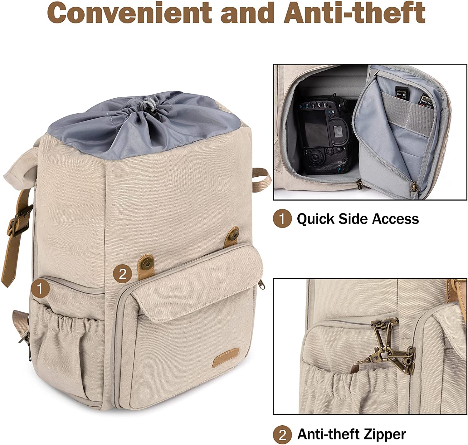 • Keep Camera Safe- Waterproof: made of durable and waterproof canvas, includes a rain cover. Anti-theft: lockable zippers and a high-quality metal hook can achieve the purpose of anti-theft.