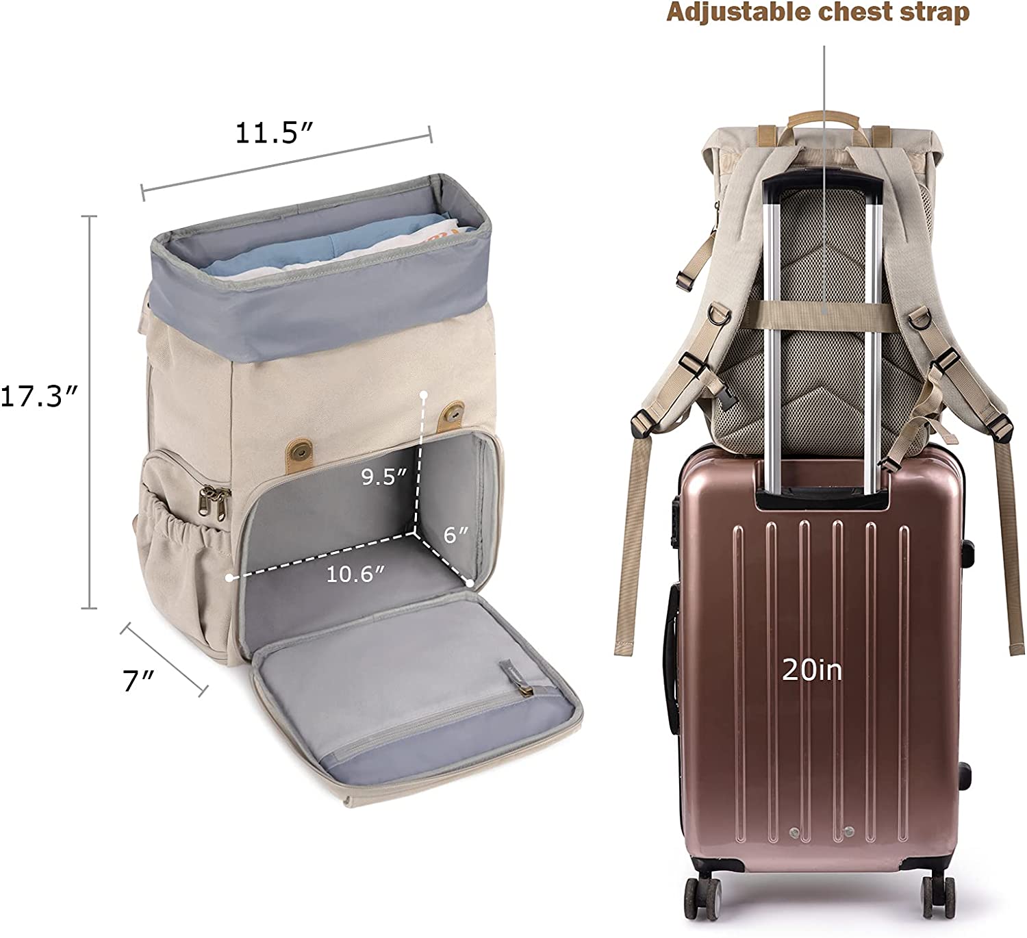 • Large Capacity Camera Backpack- 11.5"L x 7"W x 17.3"H. The upper storage space for storing clothing or other personal stuffs. The lower camera zone for 1 DSLR camera with 70-200mm lens attached, 3-5 standard lenses and other camera accessories. 1 separate thick-padded laptop compartment fits up to 15 inch laptop with shock absorbing padding bottom.