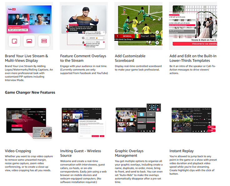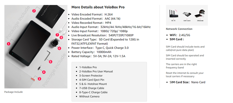 • 【All in One】 YoloBox Pro is a full HD live broadcast device integrating encoder, switcher, monitor and recorder, with built-in battery and native support for 4G LTE, WiFi, Ethernet. Perfect for Worship, Weddings/Funerals, Sport, Events, Corporate, Education, Retail Business and Much More.