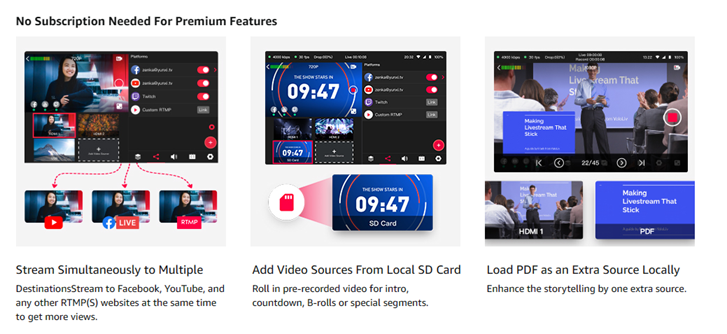 • 【Desktop features you won’t find anywhere else】 No subscription needed for multi-streaming to up to 3 platforms simultaneously; No subscription required for Featuring Comment Overlays to the Stream to engage with your audience in real time. All customizable graphic overlays(Logos/Watermarks/Customized Rolling /Captions/Scoreboard/Lower-Thirds To Make Your Stream Look Pro) are all built-in with no additional cost.