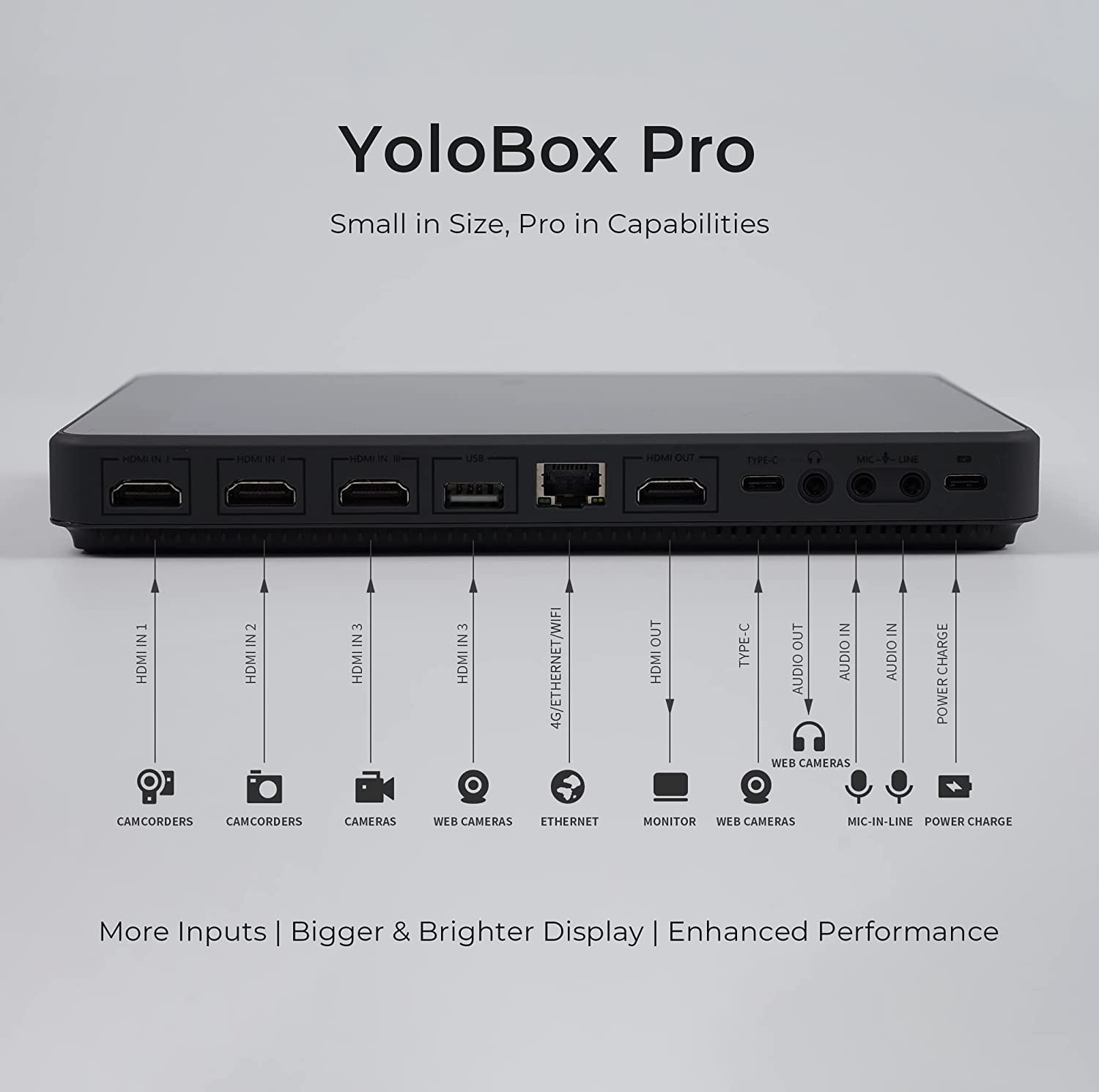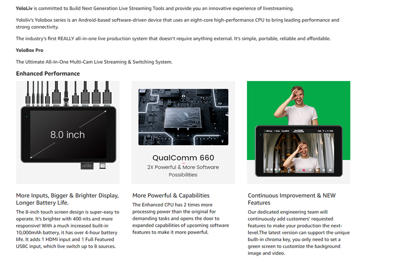 • 【Stronger and More Powerful】 YoloBox Pro has more HDMI Inputs, Bigger & Brighter Display, Longer Battery Life, Enhanced CPU. The 8-inch touch screen design is still super-easy to operate, control at your fingertip, just as your smartphone. It’s brighter with 400 nits and more responsive! With a much increased built-in 10,000mAh battery, it has over 4-hour battery life. The NEW CPU from QualComm SnapDragon has 2 times more processing power than the original for demanding tasks.