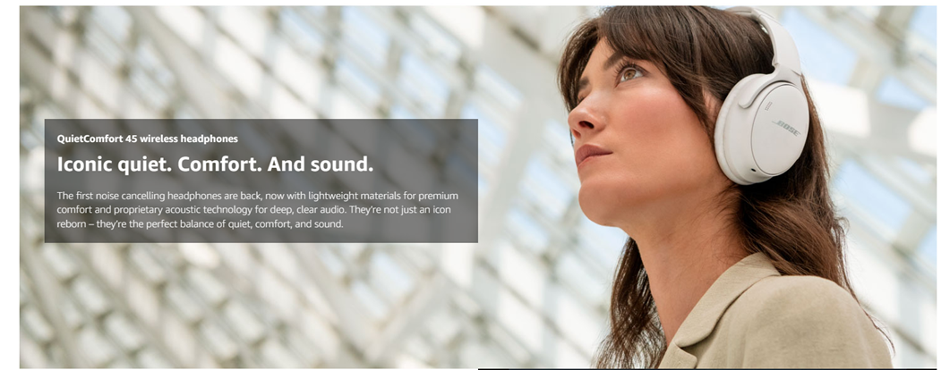 The first noise cancelling headphones are back, with world-class quiet, lightweight materials, and proprietary technology for deep, clear sound and adjustable EQ so you can tune your music to your liking. Bose QuietComfort 45 headphones aren’t just an icon reborn – they’re the perfect balance of quiet, comfort, and sound. Plus, everything that made the first around ear headphones an icon is still here. Just refined. Like an updated design with smooth cushions and a clean look. Plush synthetic leather, impact-resistant glass-filled nylon, and cast-metal hinges were all selected for their comfort as well as their durability. Add in minimal clamping force, and you’ll almost forget you’re wearing Bluetooth wireless noise cancelling headphones. Enhanced Acoustic Noise Cancelling™ technology produces the true quiet needed to hear every detail of your music in high fidelity. Or, choose the new Aware Mode to hear your music and your environment together. TriPort acoustic architecture and Bose's innovative Volume-optimized Active EQ add depth and clarity while maintaining balance at any volume. And lightweight materials such as synthetic leather and glass-filled nylon were meticulously selected for comfort and durability. The headphones offer 24 hours of play time*, charge via USB-C®, and feature six microphones for clearer calls. Bluetooth® 5.1 maintains a strong connection, and the Bose Music app guides you through setup, lets you personalize settings, and keeps your headphones’ software up to date.