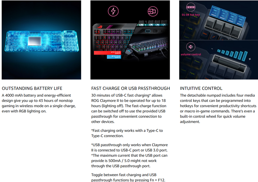 The ROG Claymore II elite gaming keyboard delivers a host of features designed to give you exciting new ways to play. Create your ideal gaming setup by placing the new detachable numpad on whichever side you prefer; then choose between wired or wireless mode and light it all up with Aura Sync. And once you’re in battle, assume full tactical control with ROG RX Optical Mechanical Switches and customizable hotkeys. The detachable numpad can be attached on either side of the keyboard, or it can be removed entirely if you prefer to use ROG Claymore II in TKL mode (80%). It can also be programmed to be used as a macro keypad for complex in-game commands. This flexibility gives you various combinations to suit your play style and gaming setup. ROG RX Red and RX Blue Optical Mechanical Switches offer consistent, wobble-free keystrokes with a superfast 1 ms response and 100-million-keystroke lifespan. These premium switches have a hollow-square stem design and they feature embedded RGB LEDs providing all-round per-key lighting. Play in wired or wireless 2.4 GHz RF mode, with a superfast 1 millisecond response time. A 4000 mAh battery and energy-efficient design give you up to 43 hours of nonstop gaming in wireless mode on a single charge, even with RGB lighting on. 30 minutes of USB-C fast charging* allows ROG Claymore II to be operated for up to 18 hours (lighting off). The fast-charge function can be switched off to use the provided USB passthrough for convenient connection to other devices. The detachable numpad includes four media control keys that can be programmed into hotkeys for convenient productivity shortcuts or macro in-game commands. There’s even a built-in control wheel for quick volume adjustment. With wireless Aura Sync RGB, the entire color spectrum and a range of dynamic lighting effects are at your command. Individually lit keys allow you to create a keyboard that’s uniquely yours. Customize and shine in your own way, wirelessly.