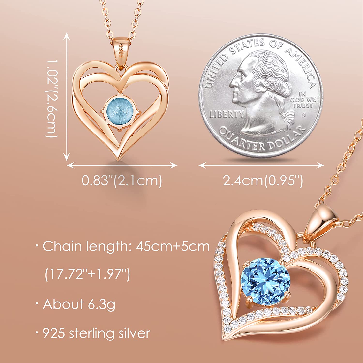 • ♥️【925 STERLING SILVER MATERIAL】Pendant size for the sterling silver birthstone necklace women : 0.83"ⅹ1.02" | Zircon size : 0.3"ⅹ0.3" | Chain length : 17.72"+1.97". The pendant and the chain are made of 925 STERLING SILVER with rose gold plating. These safe materials are hypoallergenic and antioxidant and won't rust, fade, corrode, tarnish or turn your skin green. GIVE YOU A BETTER PRODUCT EXPERIENCE !