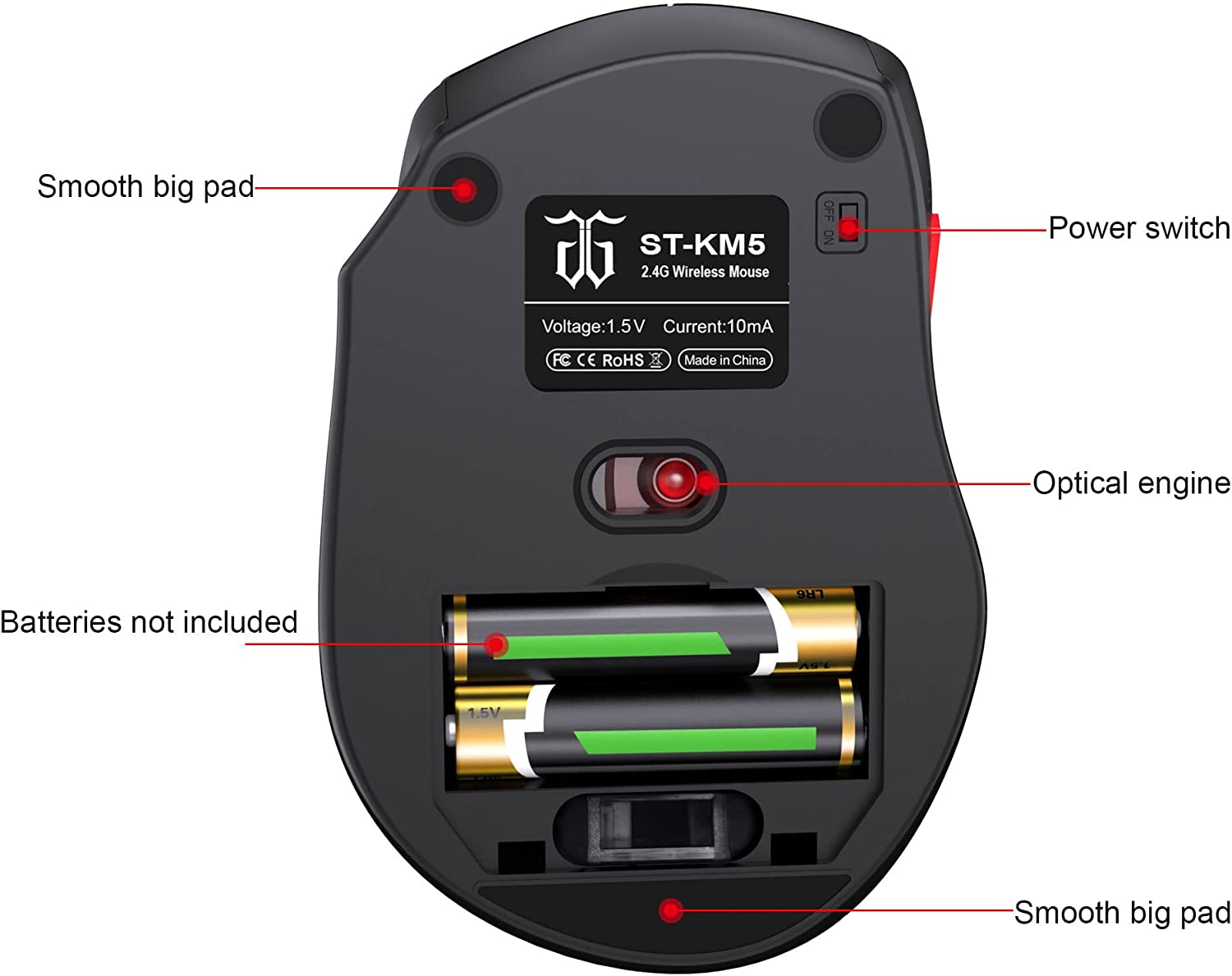 • Charging Instructions: There will be a little delay if the battery power of the keyboard and mouse is too low. Please use a DC:5V adapter to charge it. The charging indicator will turn off when fully charged. (If you use the USB interface to charge, due to the small current and large battery capacity, the charging time will be very long)