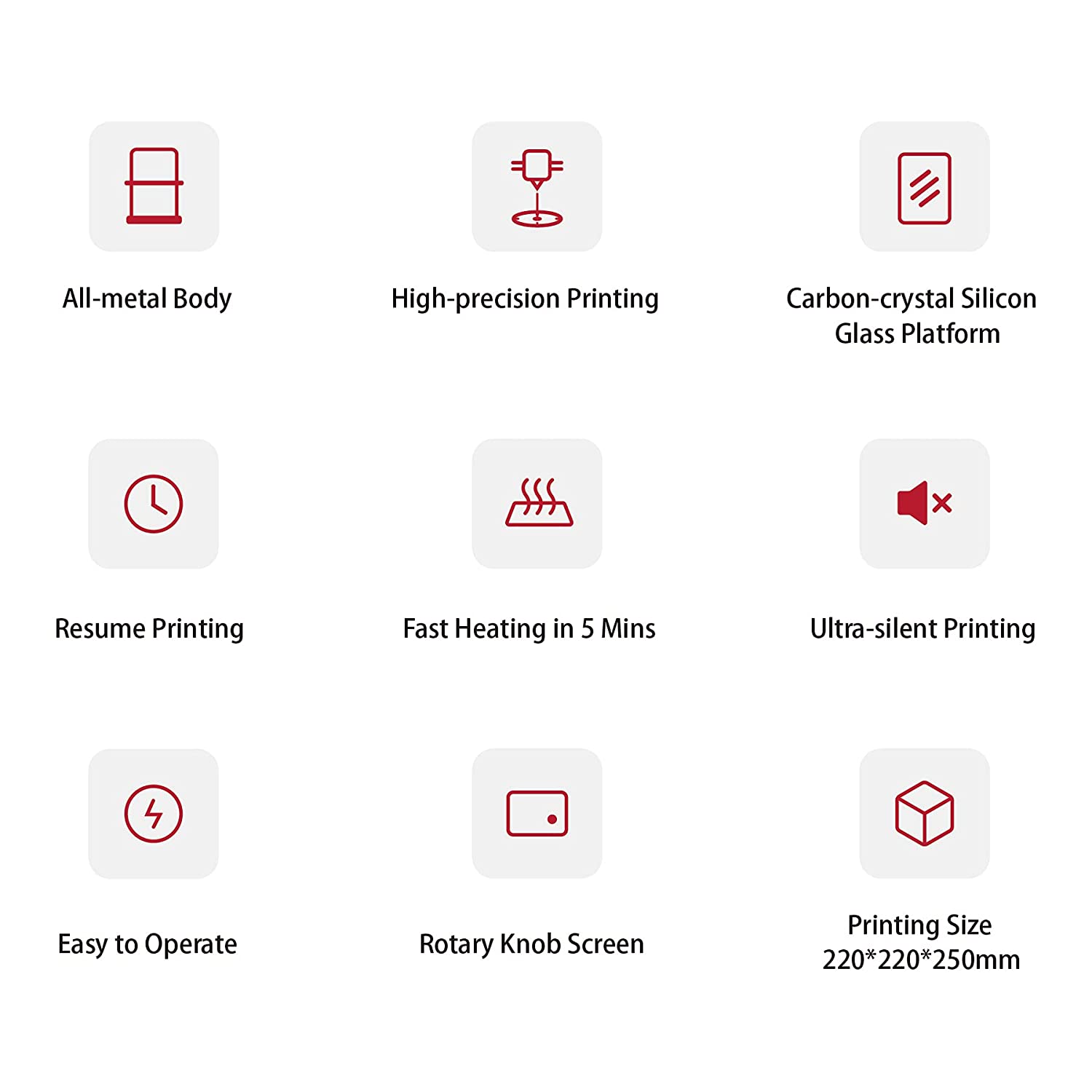 • Resume Printing Function: Aquila 3D printer could automatically resume printing when power comes on. It won’t print from scratch once meeting filament breakage, saving time and avoiding waste.
