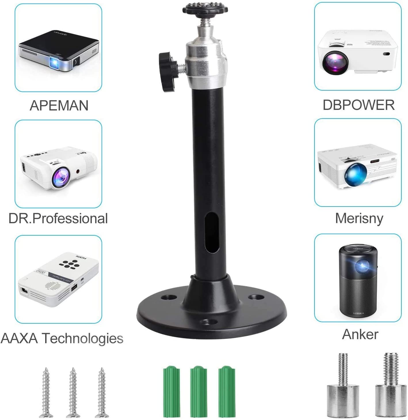 - Simple & Convenient: The projector mount pole is easy to be installed with accessories, screws and 3 adapters. Just rotate the knob to and tighten it to get the best angle.
