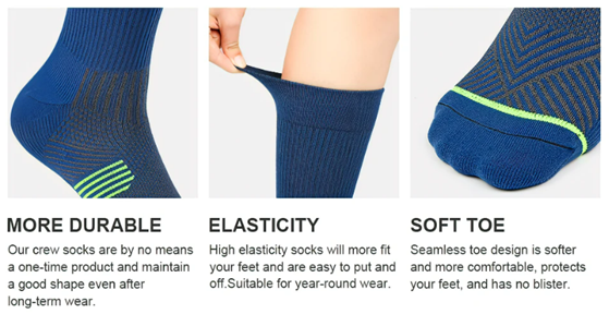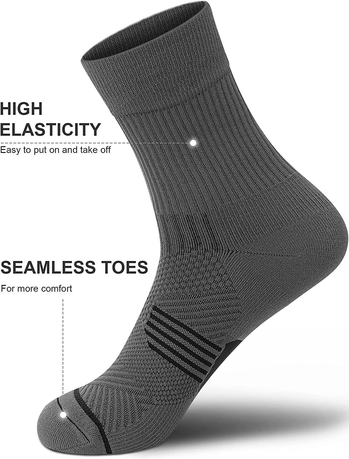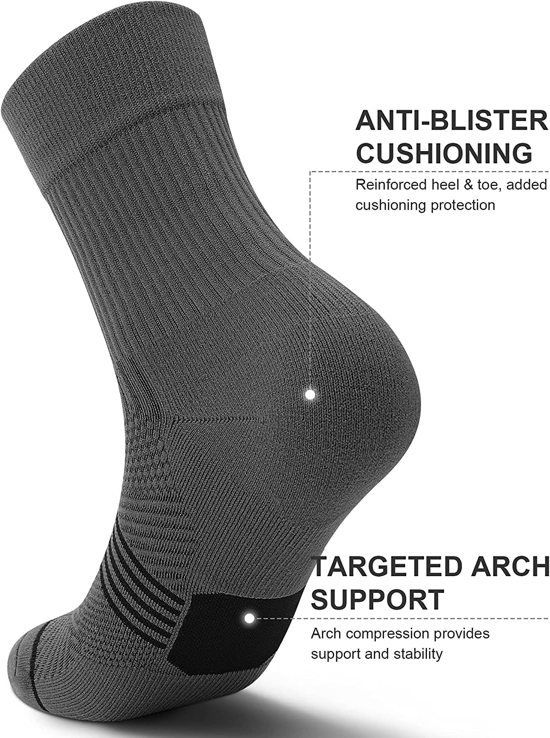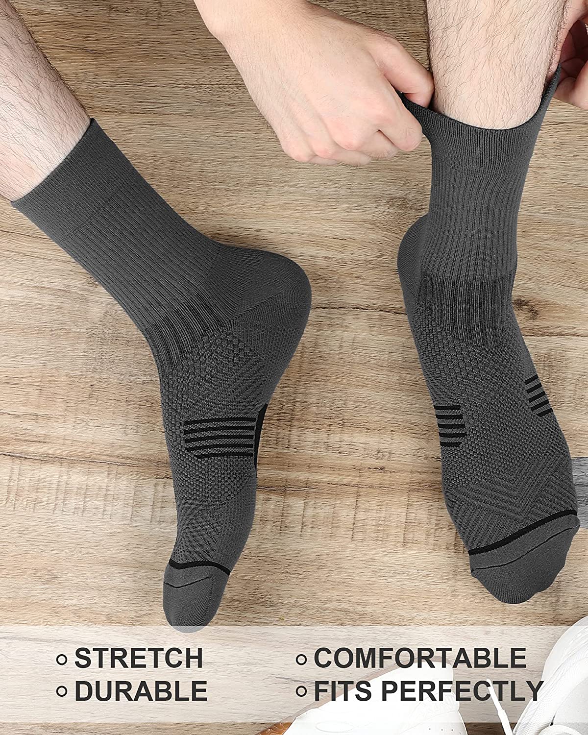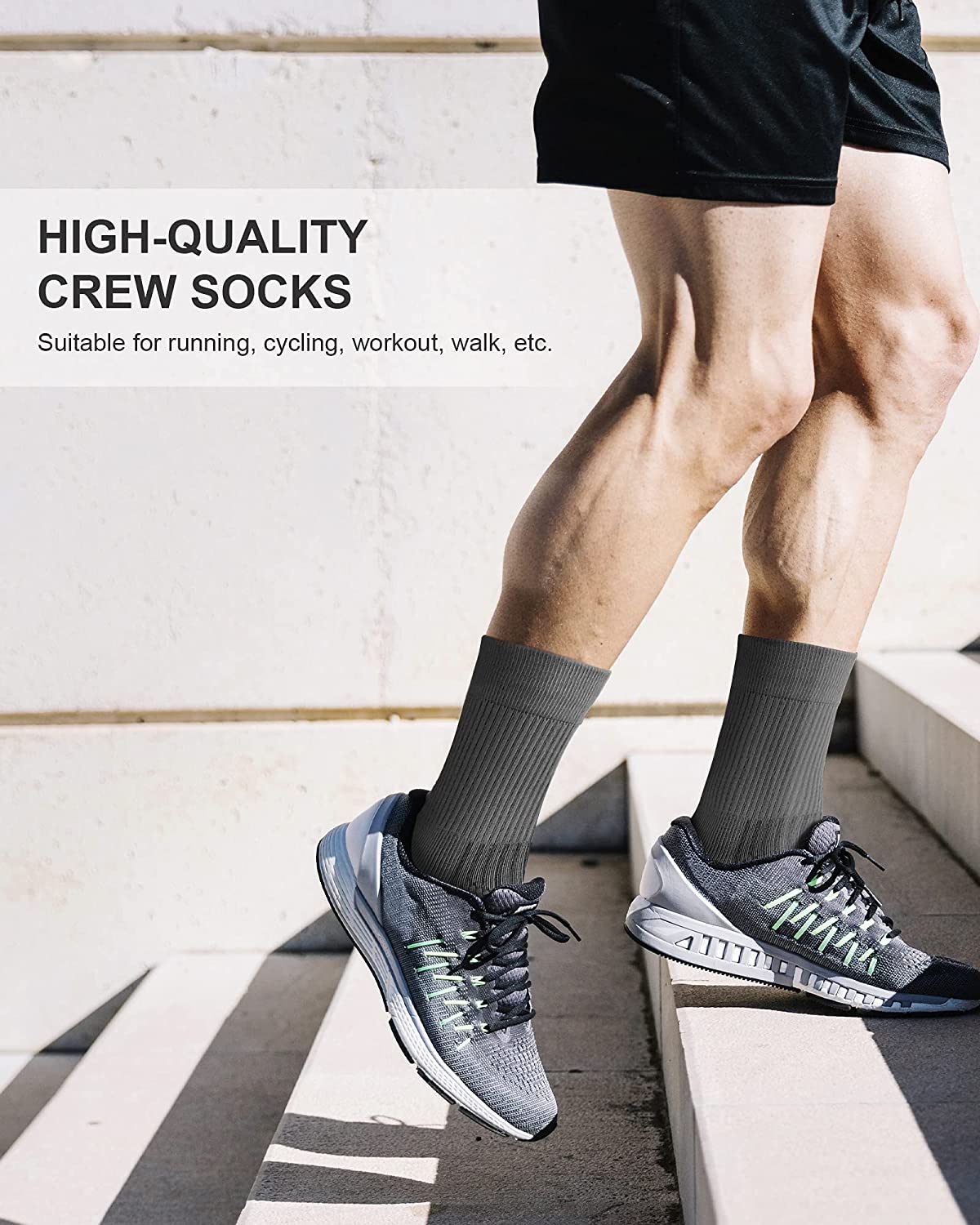 • HIGH QUALITY & DURABLE: Mens compression crew socks are made of high-quality material, which can absorb moisture and sweat and keep your feet dry all day. Reinforced heel and toe area to enhance the durability of the athletic socks, even if worn for a long time. This is not the kind of crew socks you replace after 10 washes!