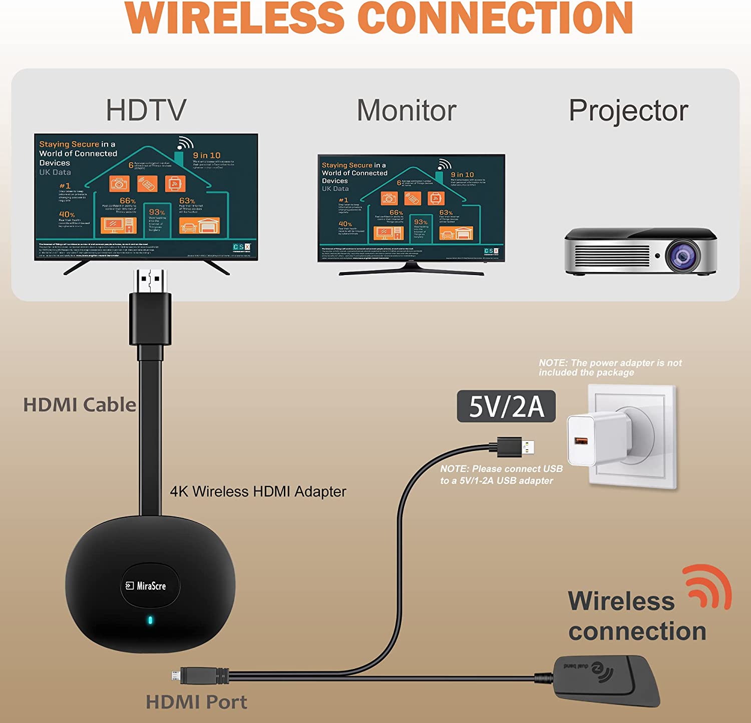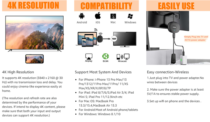 TIMBOOTECH 4K HDMI wireless display dongle is compatible with iOS/Android/Windows/Mac IOS systems, including iPhone, iPad, Macbook, Samsung, Xiaomi, Huawei, etc. It also supports Airplay/Miracast/DLNA.