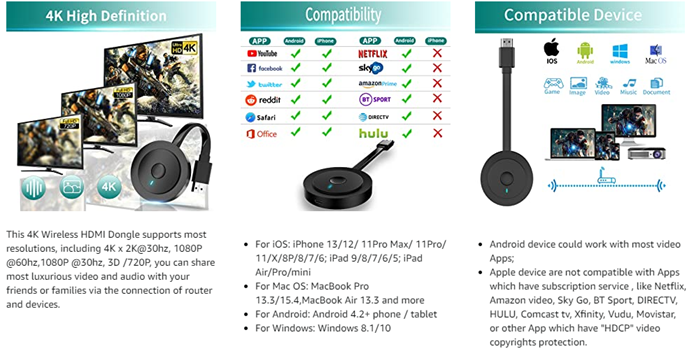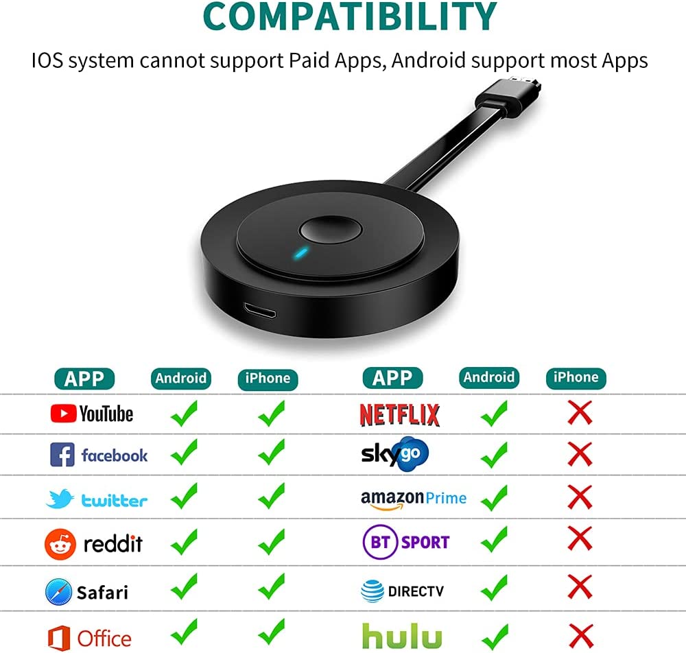 • ?【Mirror Apps Limited for iOS Devices】Plug HDMI wireless dongle into your TV and cast most media you want from iPhone, iPad, Macbook, including movies, photos, music, Safari, Office apps, Youtube, Whatsapp, Skype, Twitter, Reddit, etc. ✅Note: NOT Compatible with Netflix, Hulu, Spotify, Sky Go, or other HDCP copyright apps.