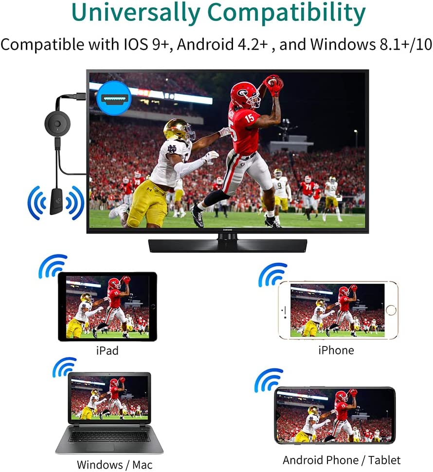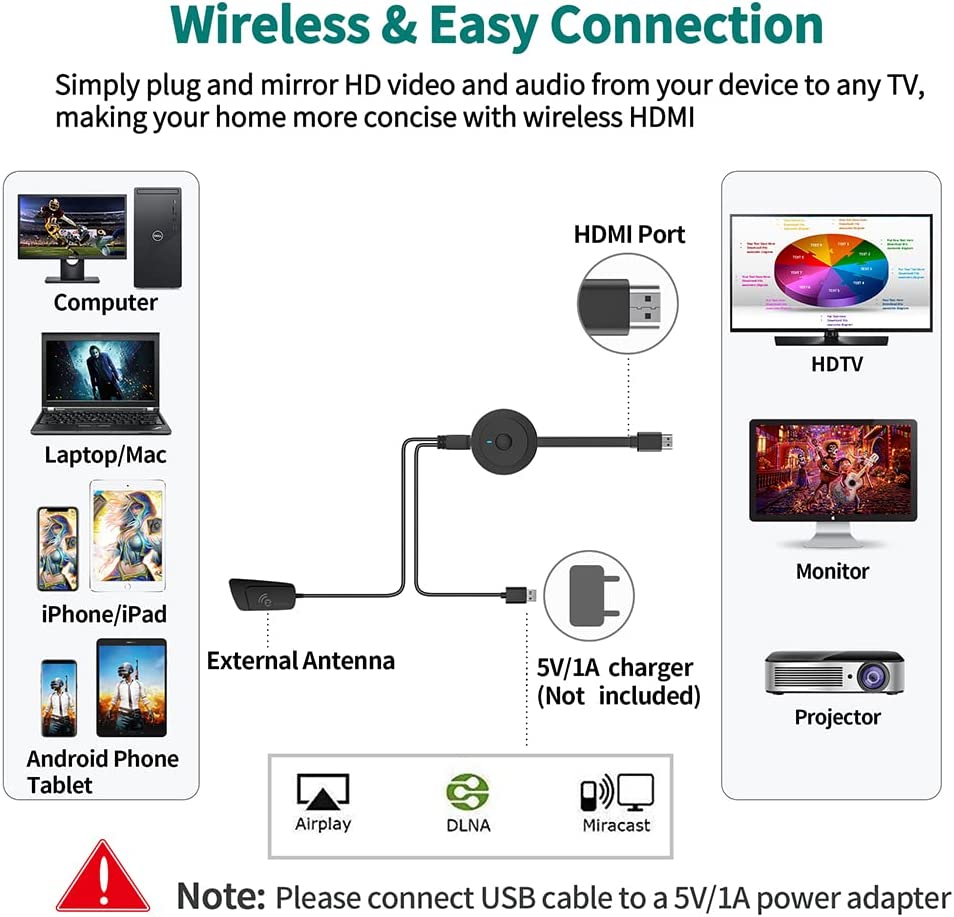 • ?【Wireless & Easy Connection】 No apps, no bluetooth needed. Get connected and casting in minutes. Simply plug external antenna to dongle, connect it into the HDMI port, power it, find mirror function. You will enjoy HD video and audio from your device to any TV. Making your HDMI wireless.