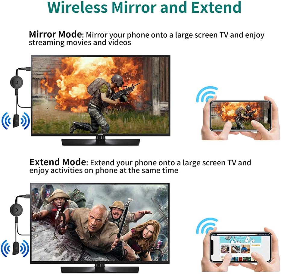 • ?【Mirror and Extend Mode】 This Wireless HDMI Dongle supports resolutions 4K x 2K at 30Hz, 1080P at 60Hz, 1080P at 30Hz, 3D / 720P. You can share the most luxurious video and audio with your friends or family members. With the extend mode, it allows you to cast video in the TV and play phone at the same time.