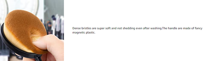 • ?【NO SHEDDING】---The bristles stay intact and there are no hair fragments to pick off face after using the brush.No shedding of bristles. Provides great coverage.ergonomic rubbery type grip helps to keep a GRIP on the brush.Perfect length for daily makeup needs.