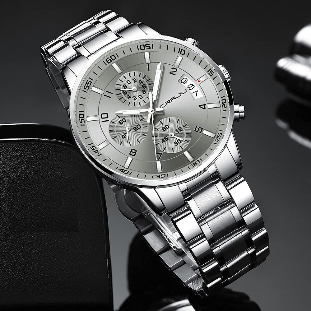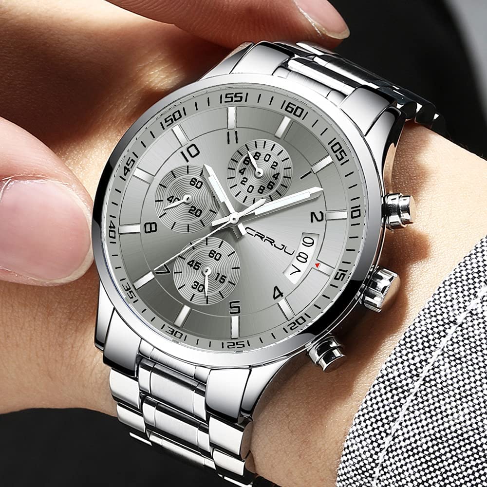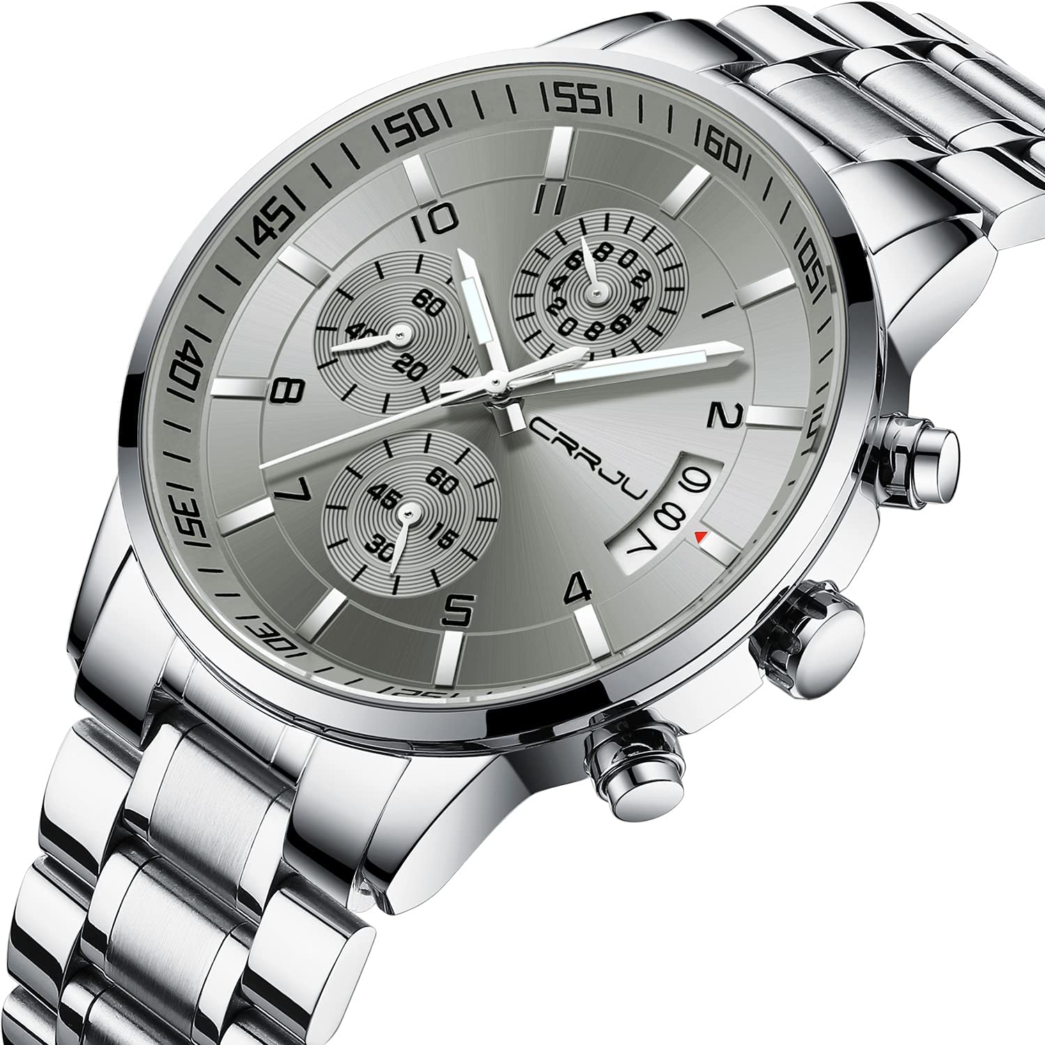 CRRJU Men's Fashion Stainless Steel Watches Date Waterproof Chronograph Wristwatches,Stainsteel Steel Band Waterproof Watch