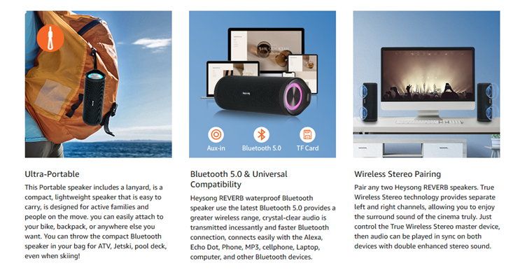 - [ Powerful IPX7 Waterproof Speaker ]: Take your music anywhere, even in the water! The HEYSONG waterproof Bluetooth speaker is fully sealed and can be immersed in up to 1 meter of water for up to 30 minutes. The water vapor in bathroom will never interfere with the sound quality of the waterproof speaker. It's resistant to rain, dust, snow, sand, mud and spills, No worries about weather, a great Bluetooth speaker for Shower, Pool, Beach, Swimming, Surfing, Water Parks, Kayaking, Home, Travel.