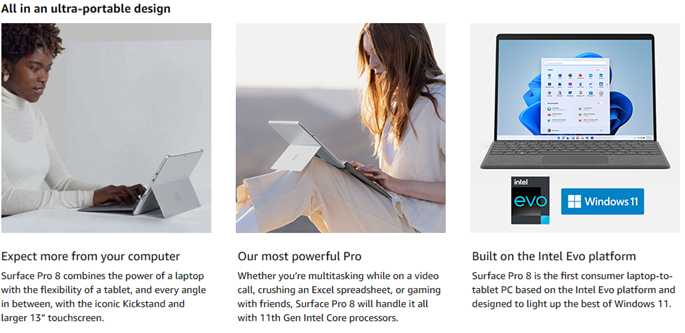 Unlock more possibilities than ever with the Pro designed for a Pro like you. The first consumer laptop-to-tablet PC based on the Intel® Evo™ platform and designed to light up the best of Windows 11, Surface Pro 8 combines the power of a laptop with the flexibility of a tablet, and every angle in between, with the iconic Kickstand and detachable Keyboard* with built-in Slim Pen storage and charging.** Do great things with a larger 13” touchscreen, faster connections with Thunderbolt™ 4 ports, and extra speed when you need it.