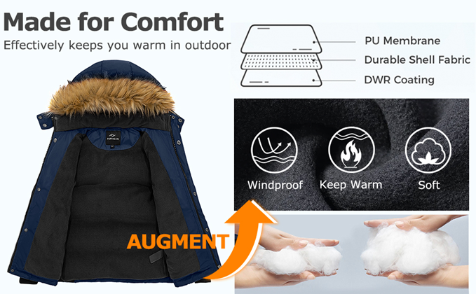 Windproof Parka: (1) Elastic ribbed cuffs and removable fleece hood to seal in warmth in cold days. (2) Stand collar, a full zipper with button placket helps lock temperature.