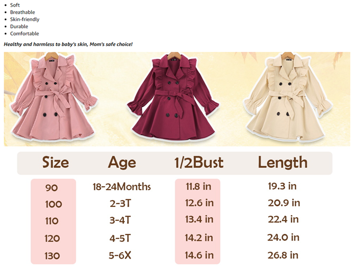 Feature: This baby girl's trench coat is button-down closure. Adjustable bow belt. Please notice that the jacket doesn’t have any belt loops to hold the belt. The tie around the waist is removable. You can also open it as a coat. Ruffle long sleeve. Elastic cuffs, Give your princess plenty of space to grow. Playful and adorable. Make your little girl adorable and charming, never out of style. A must-have for the princess autumn/winter wardrobe