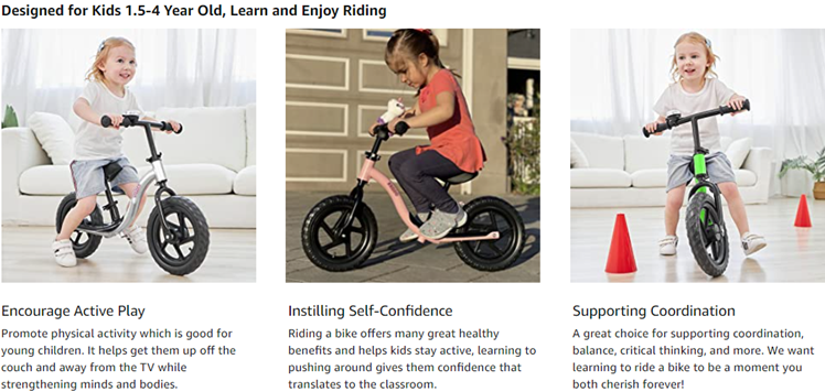 • EXTRA-THICK ALL-TERRAIN TIRES – We want kids to feel strong and stable when they’re moving on grass and sidewalks which is why we added puncture-resistant tires to the front and back of each balance bike for 4-year old’s and 18-month-old riders.