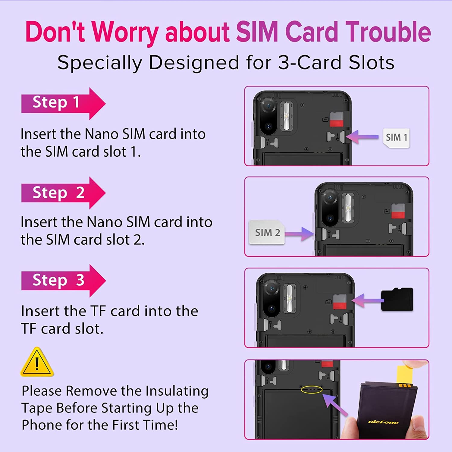• ? 3 independent card slots for 1* Nano SIM, 1* Nano SIM, 1* TF card(up to 128GB). ❤️Note: Please remove the insulating tape before starting up the phone for the first time!