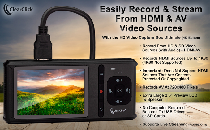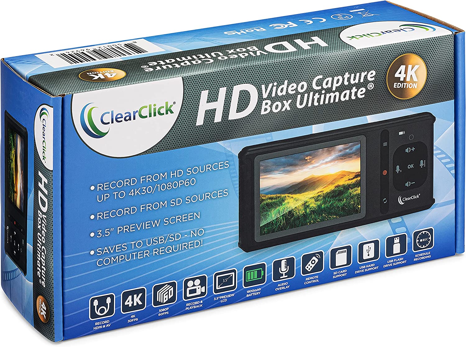 ClearClick HD Video Capture Box Ultimate (4K Edition) - Record and Stream Video from HDMI (Up to 4K30) and AV Video Sources, No Computer Required (Updated)