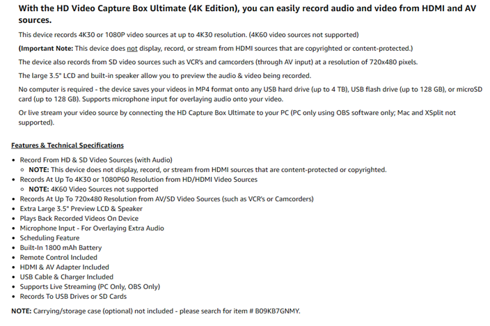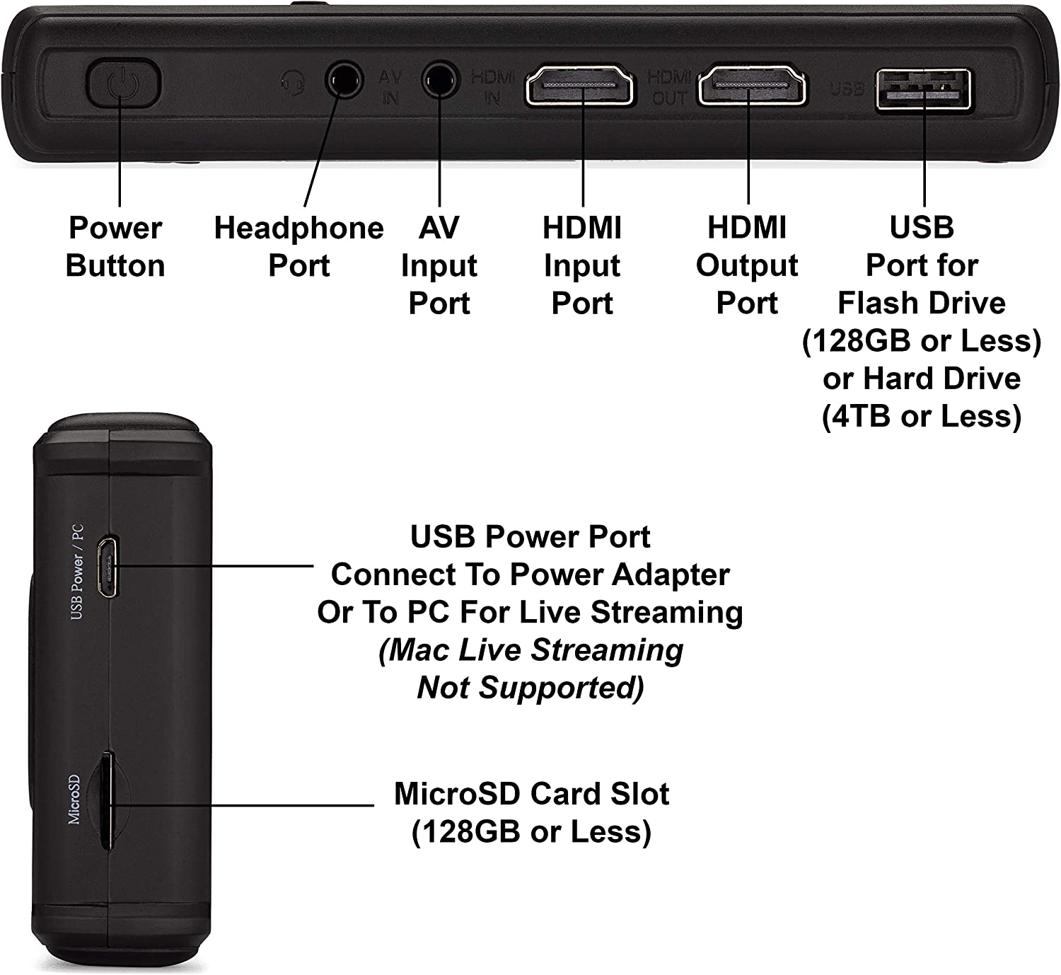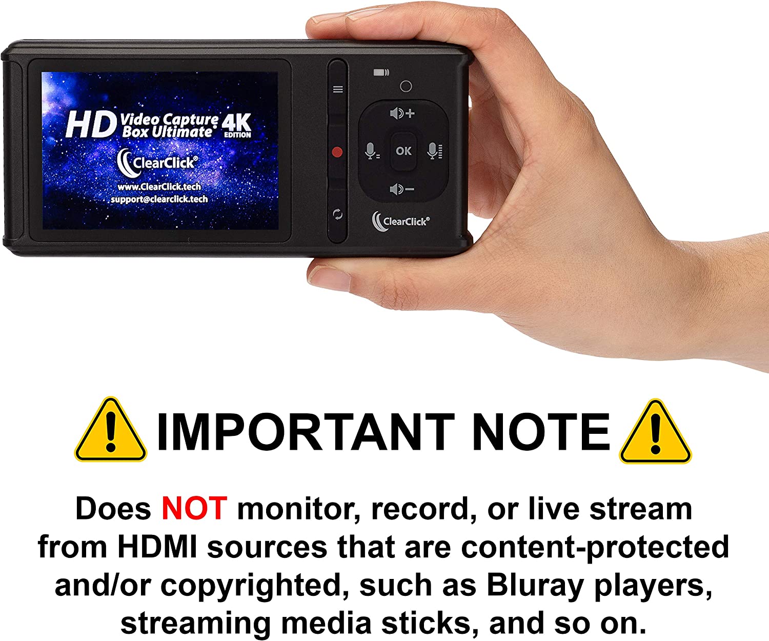 • IMPORTANT: Does NOT display, record, or live stream HDMI video sources that are copyrighted or content-protected. The device will show a black screen from these video sources. This device also does not support 4K60 (60 FPS) video input.