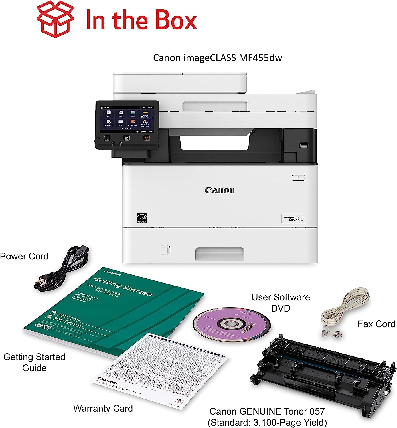• Print up to 40 ppm..In The Box : MF455dw Product, Canon Genuine Toner 057 Standard (3,100 Yield, ISO / IEC Standard), Power Cord, Telephone Cable, Starter Guide, User Software DVD-ROM, Warranty Card