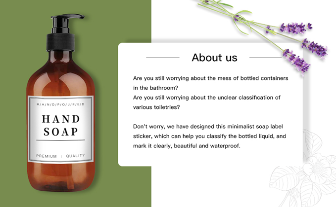 • 5.[Reusable and easy to clean]---The soap label stickers can be easily pasted on smooth surfaces, such as glass bottles, plastic bottles, shampoo and conditioner bottles,etc. The corners will not be curled and will not fall off easily. The self-adhesive label can be easily torn off and re-attached for use.