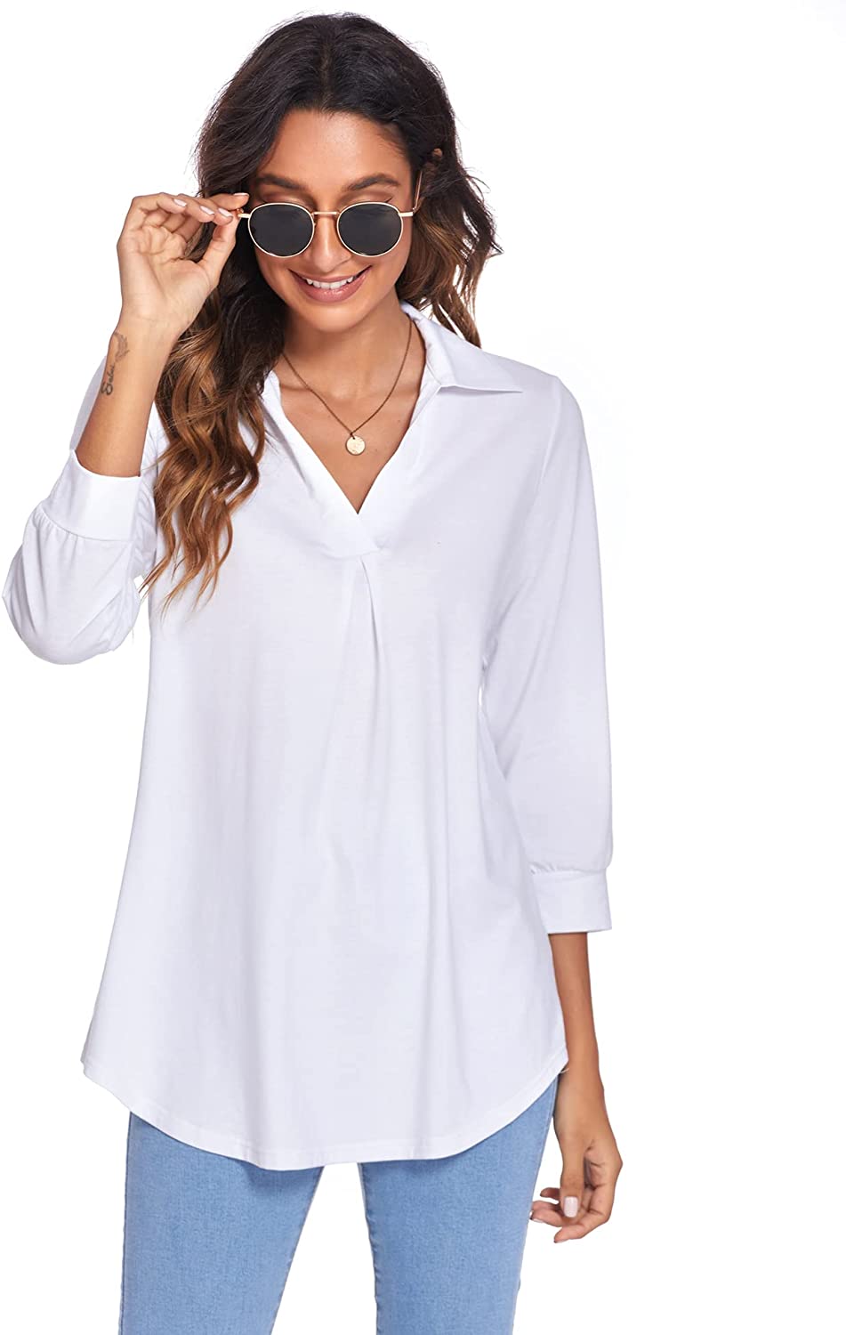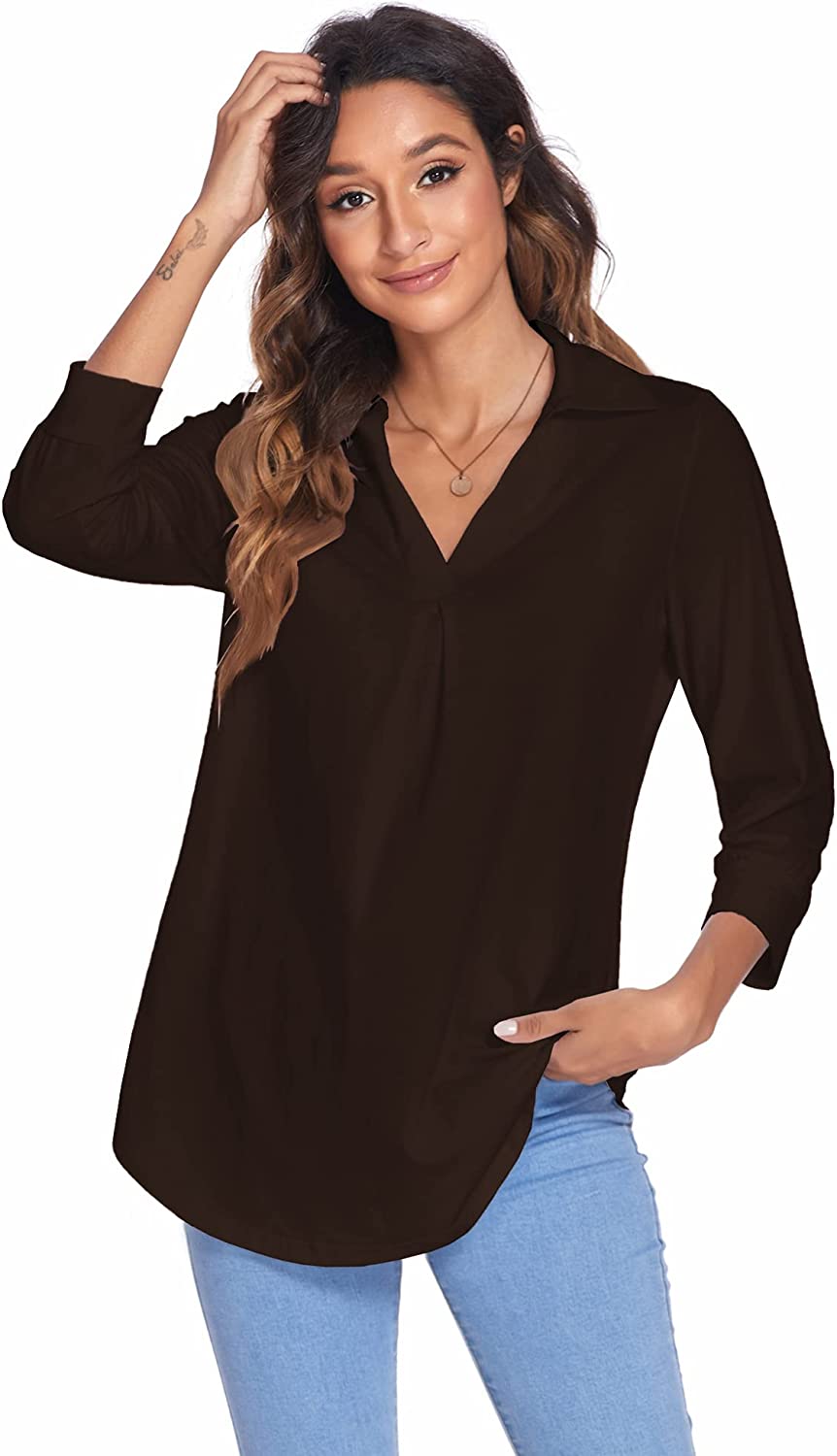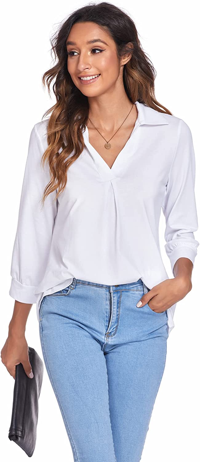 • Features: Womens tops dressy casual, blouses for women, v neck collared shirts for women, 3/4 sleeve tops for women, cute pleated in front, curved hem, loose fit style, trendy, classy, basic, womens tunics to wear with leggings.