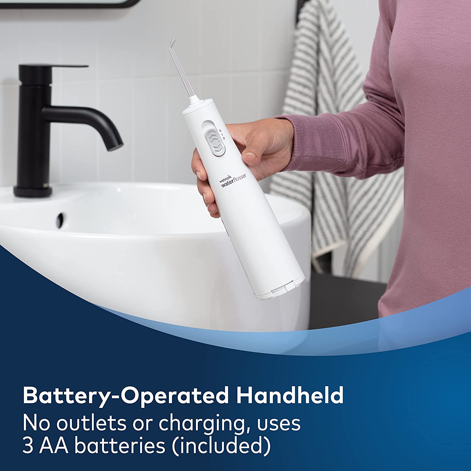 • BATTERY OPERATED HANDHELD WATER FLOSSER: The Waterpik Cordless Express Water Flosser is powered by 3 AA batteries and is designed for travel anywhere, use in the shower, and small bathrooms.