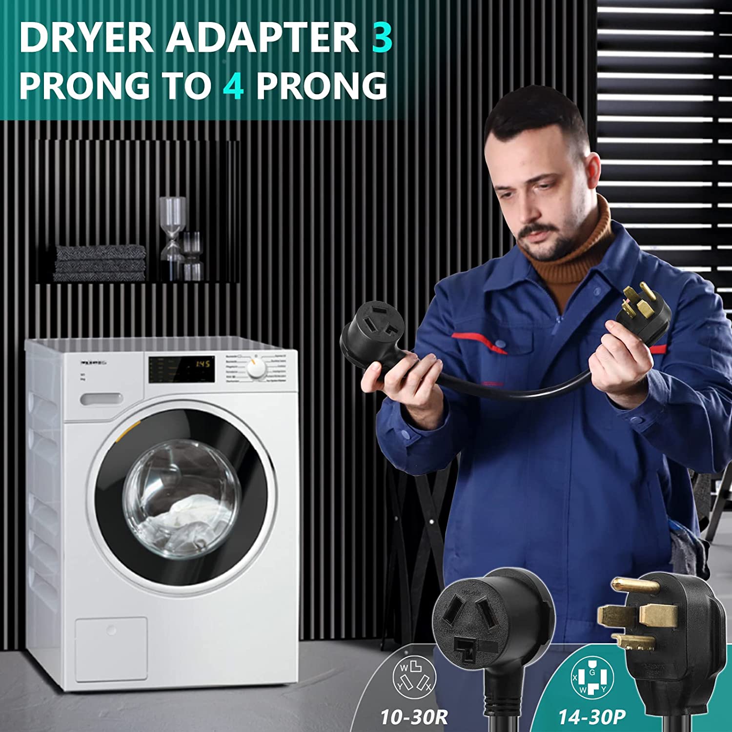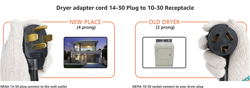 • 【Adapter for 240-Volt Electric Clothes Dryers】 30AMP (14-30P) male plug to 30AMP (10-30R) female outlet.Converts 3 prong dryer to fit a 4 slot wall dryer outlet when you moving into a new home, house or apartment.
