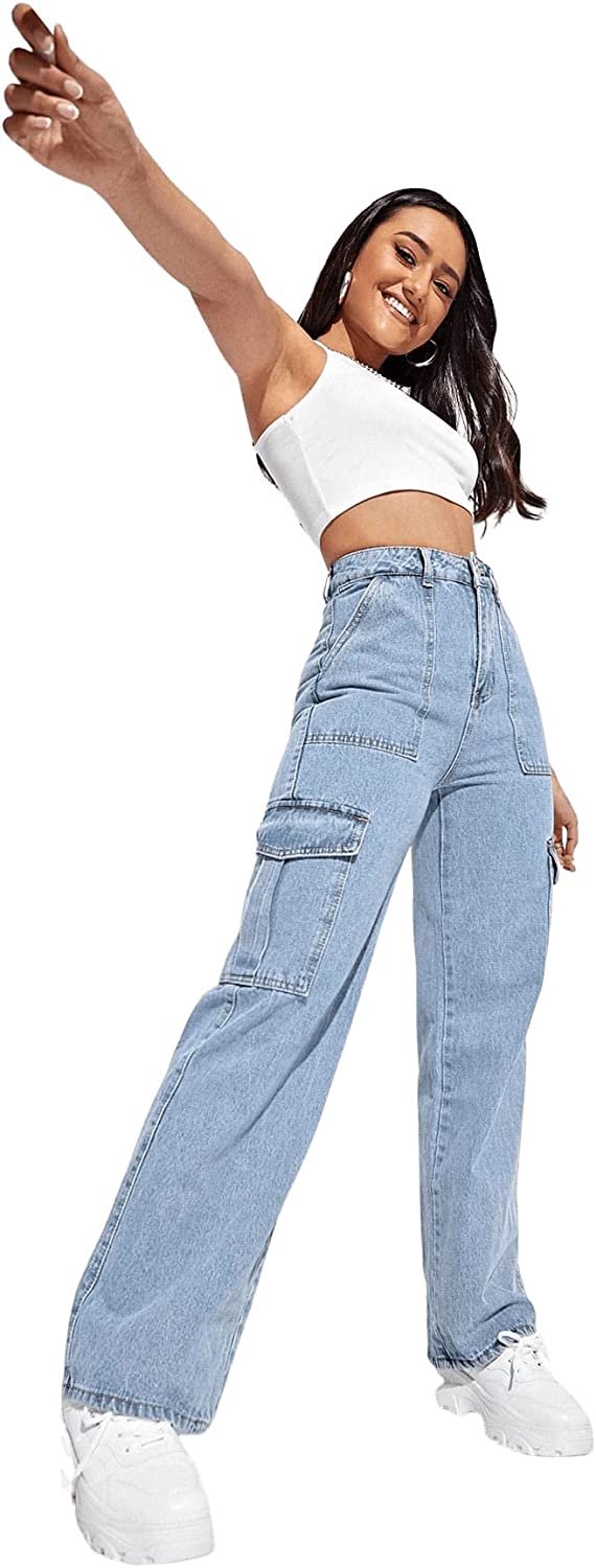 SweatyRocks Women's High Waist Cargo Jeans Flap Pocket Wide Leg Denim Pants/ Pattern Type: Plain/ Length: Long/ Type: Wide Leg, Cargo Pants/ Details: Pocket, Zipper, Button Front/ Fit Type: Loose/ Waist Line: High Waist/ Sheer: No/ Closure Type: Zipper Fly/ Fabric: Non-Stretch/