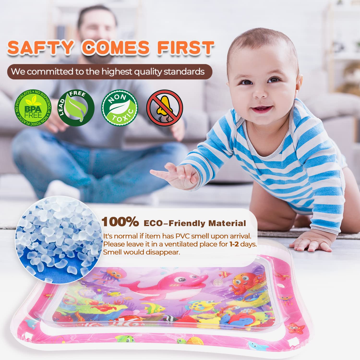 Premium quality, 100% leak-proof: Our water mat for babies is made from durable, 100% BPA-free, and non-toxic, heavy PVC materials. It allows the baby to play safely. Each infant tummy time water mat has been rigorously tested. It is durable and waterproof, so it doesn't wet your baby's body. Just let your baby enjoy the fun of tummy time without getting wet!