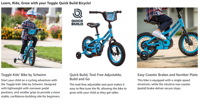 Start your child on a cycling adventure with the Toggle kids’ bike by Schwinn. Featuring a Schwinn SmartStart steel frame, the Toggle is lightweight with narrower pedal positions, and smaller grips to provide a more stable, confidence-building ride. The simple single-speed drivetrain is easy to use, while the intuitive rear coaster (pedal) brake and front hand brake deliver secure stops. The saddle is designed with kid-friendly proportions, as well as a handle that’s perfect for towing or storing the bike when not in use. Plus, the tool-free adjustable seat post makes it easy to fine tune the fit, allowing the bike to grow with your child as they get taller. But that’s not all! The Toggle is also Quick Build bike, complete with easy-open packaging and tool-free assembly for the pedals, stem, training wheels, and front wheel. Your child can be ready to ride in just a matter of minutes! Like all Schwinn bikes. Start healthy cycling habits early with the Toggle kids’ bike. Enjoy the freedom of riding a Schwinn.