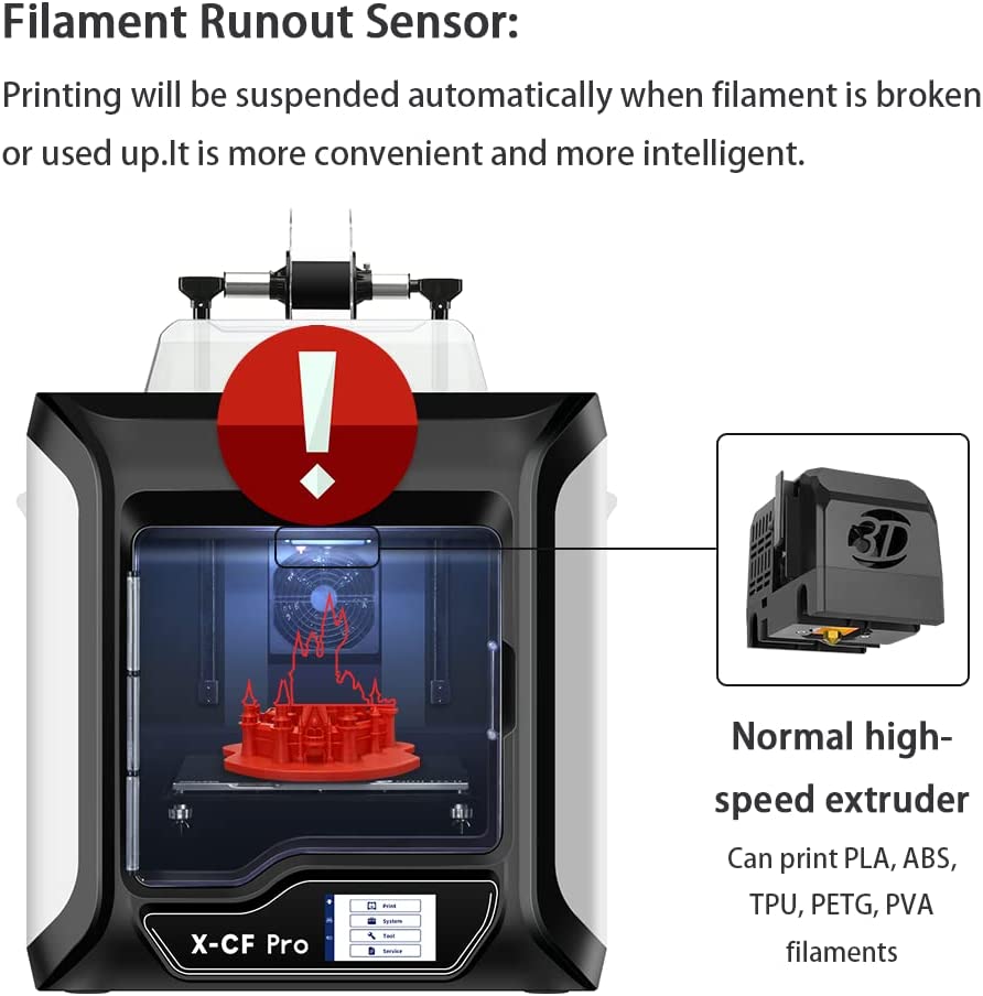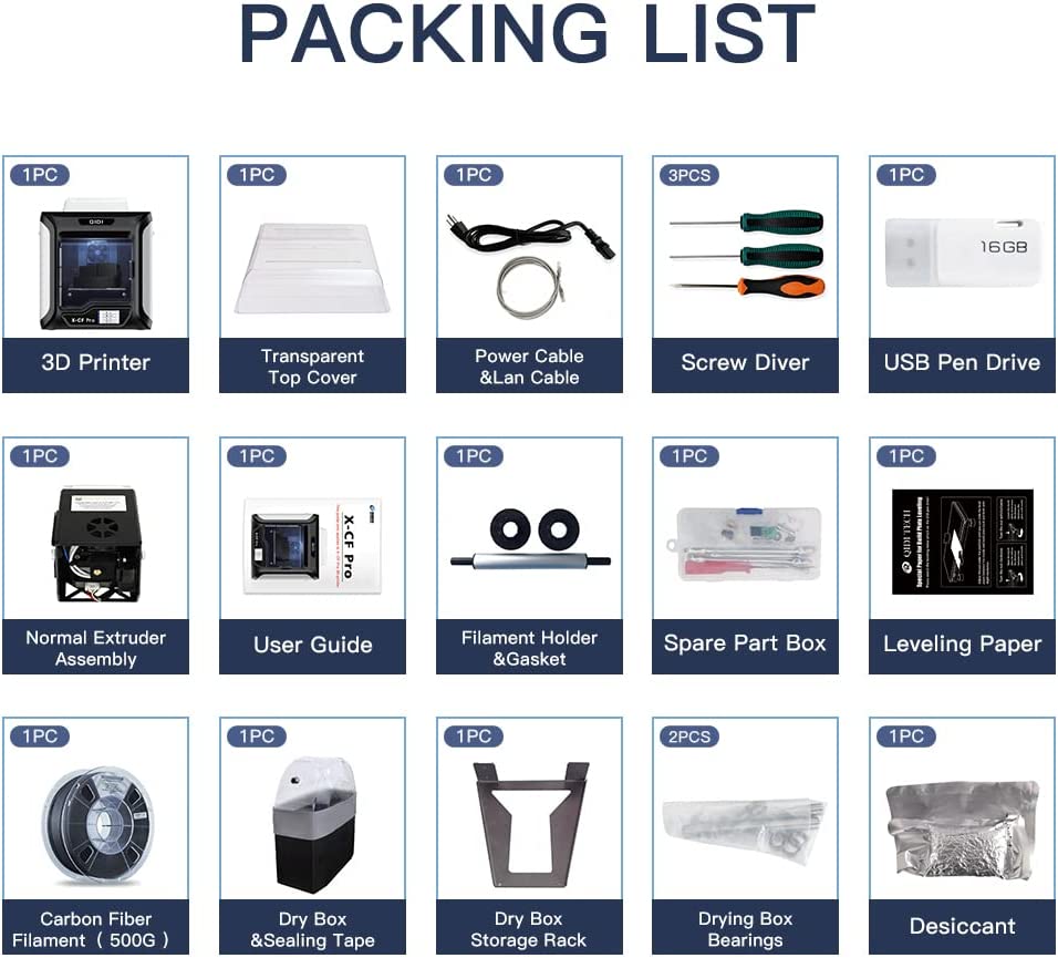 • 【QIDI TECH Service】QIDI TECH are committed to making valuable 3d printers. X-CF Pro is suitable for professional users as well as novice users.No assembly,out of the box. It is easy to print according to the operating instructions. The highly praised service of QIDI TECH is the most trustworthy. 2 year warranty(1 year + 1 extra year).