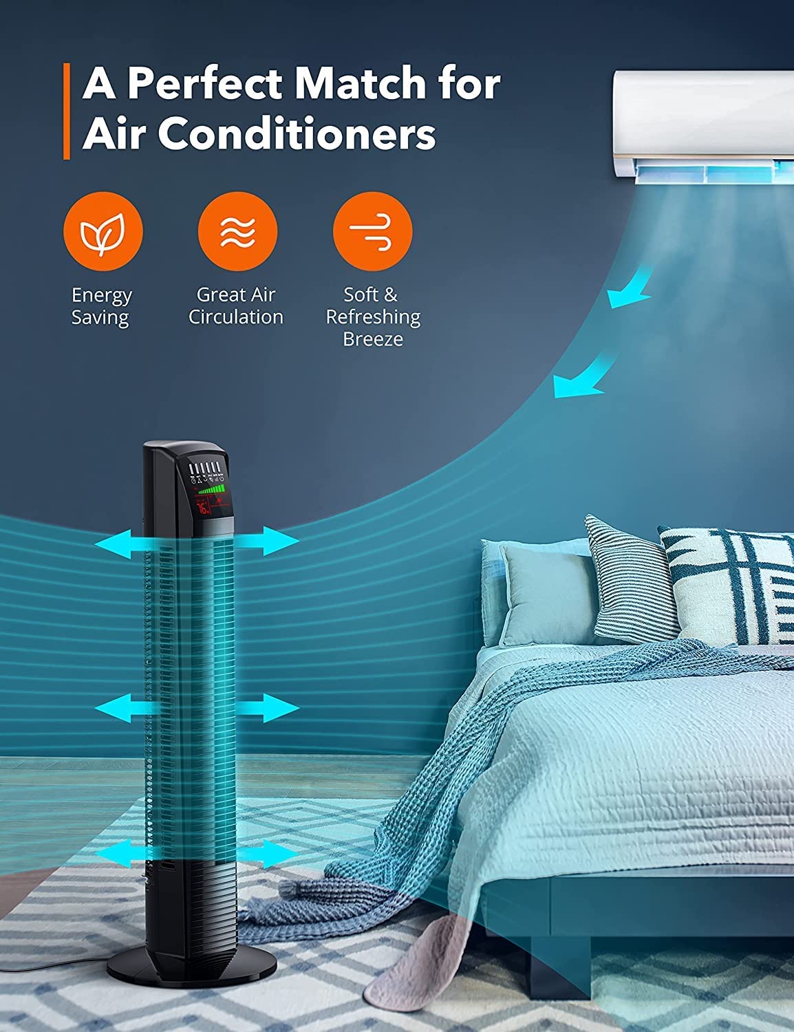 • Larger Airflow Coverage & Space Efficiency: While small fans don't take up too much space, they offer lower airflow that can't reach you in a high bed or a spacious kitchen. Our large tower fan strikes a great balance between high blow efficiency and space arrangement. Thanks to its 35" size and strong airflow, it can keep you cool anywhere, while its slim design allows you to place it anywhere, regardless of your room size.