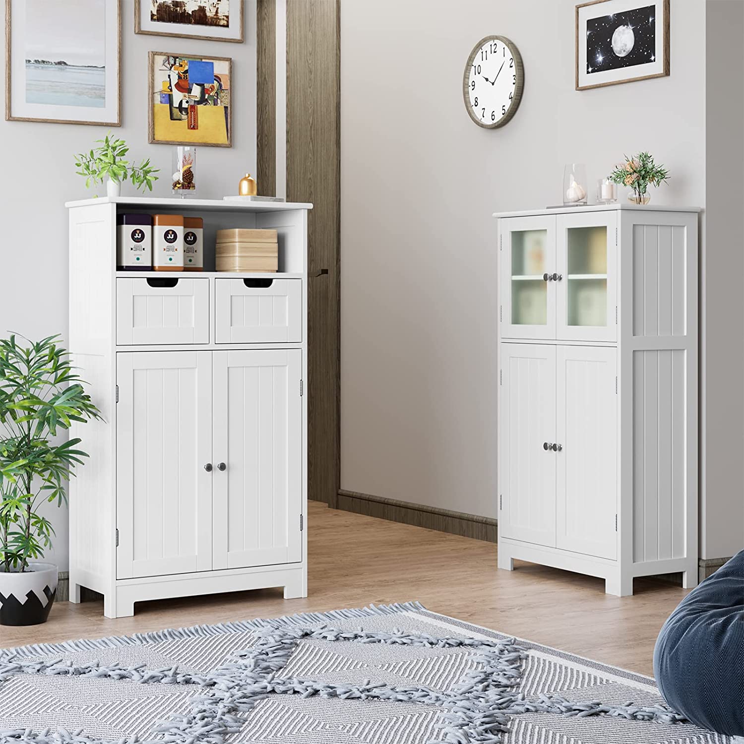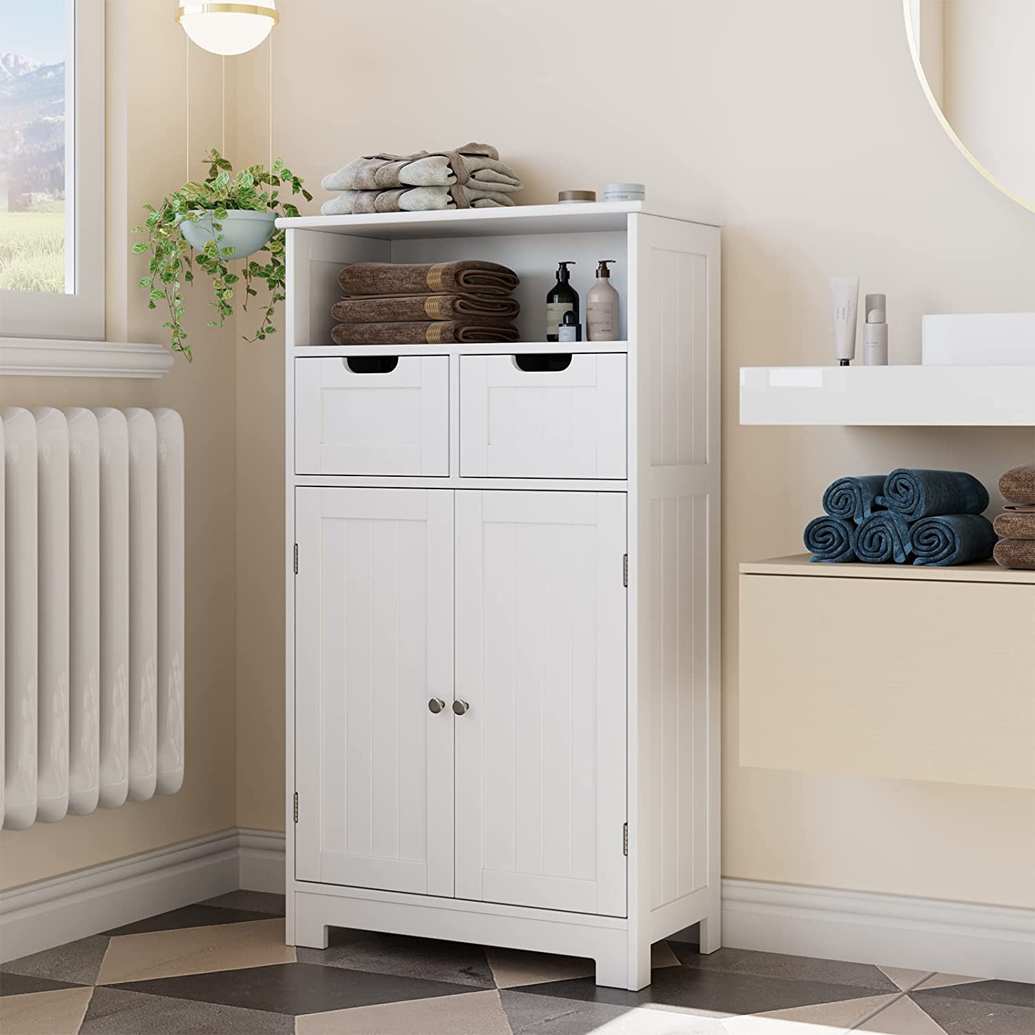 HORSTORS Bathroom Cabinet, Floor Storage Cabinet with 2 Doors and 2 Drawers, Free Standing Wooden Storage Organizer for Bathroom, Living Room, Hallway, White