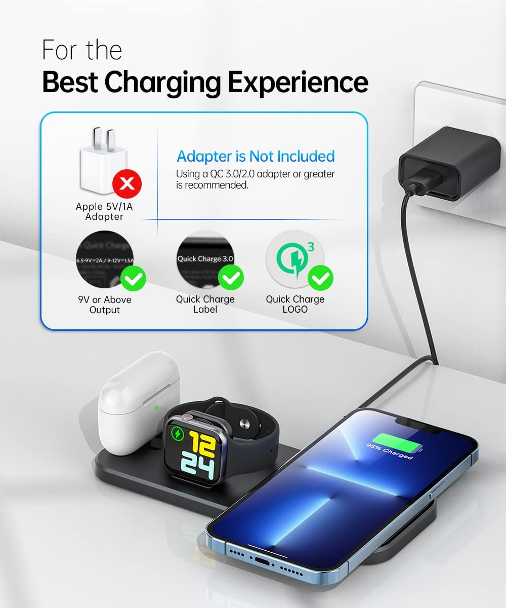 • 【You can get】3 in one wireless charging dock *1, Instructions*1, Type-C Cable(38inch)*1. (NOTE: POWER ADAPTER IS NOT INCLUDED). Recommend 10W or above adapter.