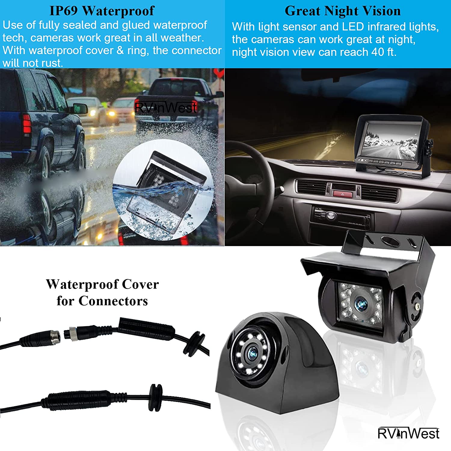 【IP69 Waterproof & Night Vision】Using full-sealed and glue-filling tech, those side view/front view/rear view camera can work great on all weathers. With infrared LED lights, those backup cameras can provide you bright & clean view at night.