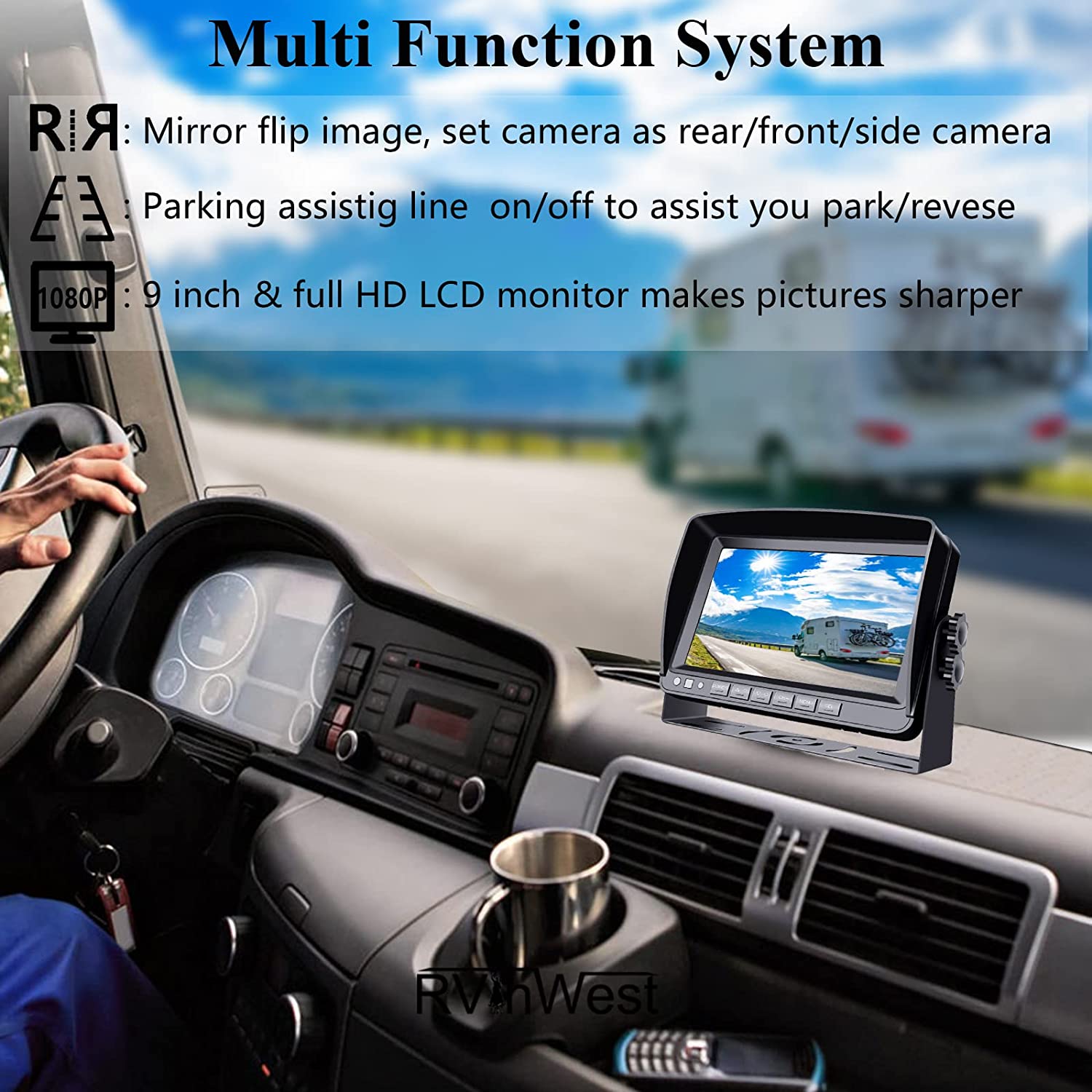 【1080P CCD Cameras + Larger LCD Screen】Using CCD chip and AHD tech, those 1080P HD cameras as backup/side view/front view/rear view camera can provide you with sharp & clean & vivid view on the 9 inch larger LCD monitor to make driving more convenient and comfortable.