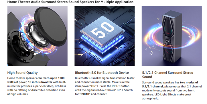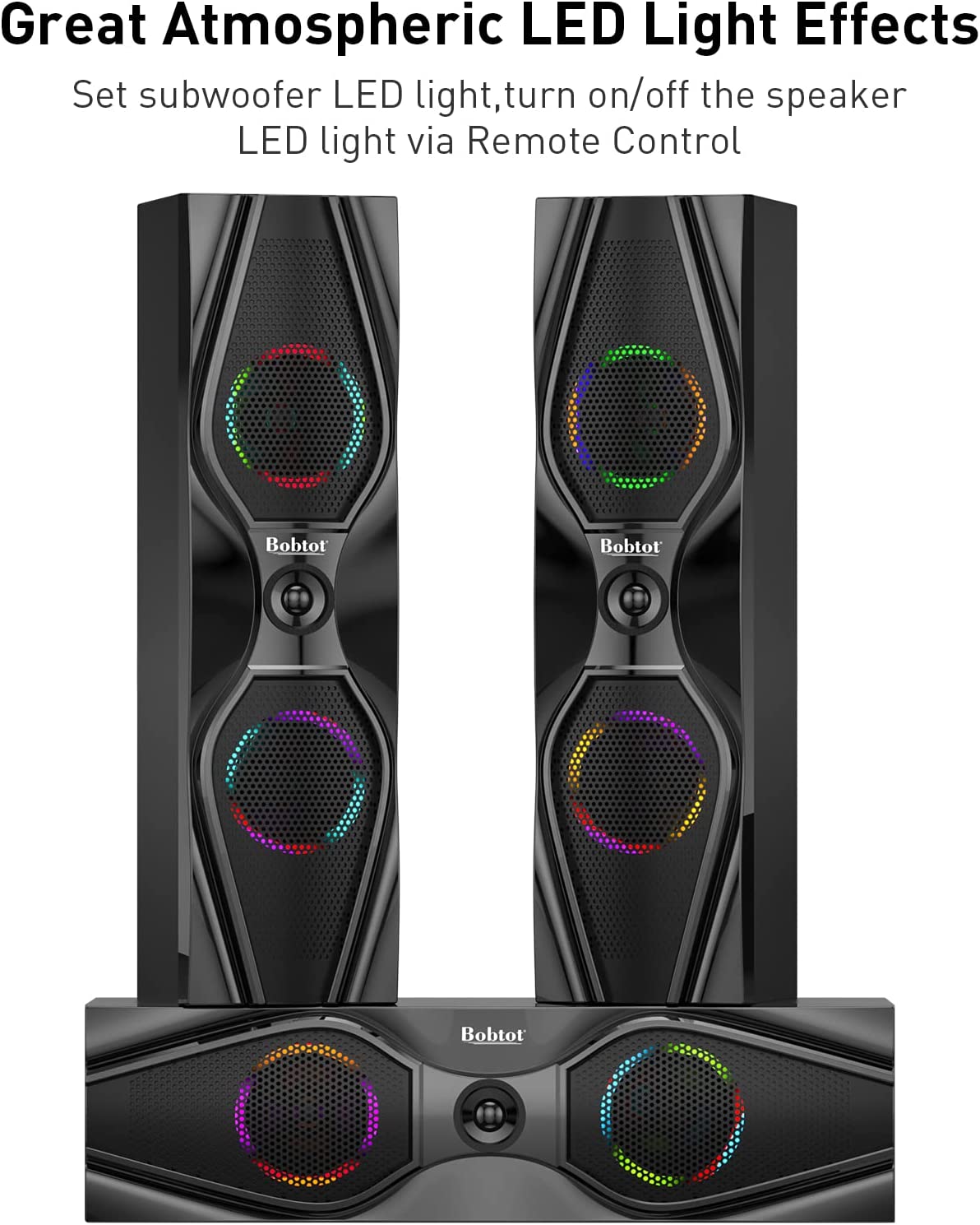 • Great LED Ambient Light Effect: The surround sound system speakers use high-quality materials, with LED lighting effect which makes full of atmosphere. The Subwoofer unit has 4 LED lighting modes: (blink to the beat, solid on, spectrum EQ analyzer, off).